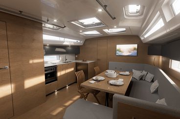 The cockpit is built for enjoyment at anchor as well as sailing pleasure. Ample seating for up to 10 people will make sure everyone has comfort on board. Optional modular cockpit table converts into two sunbeds and enables lounging and sunbathing in the cockpit as well.