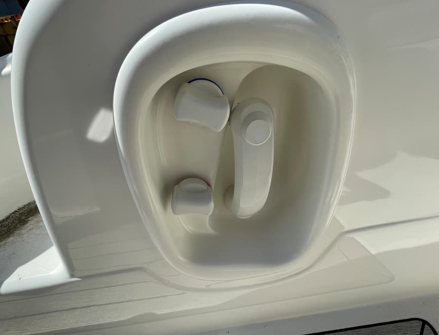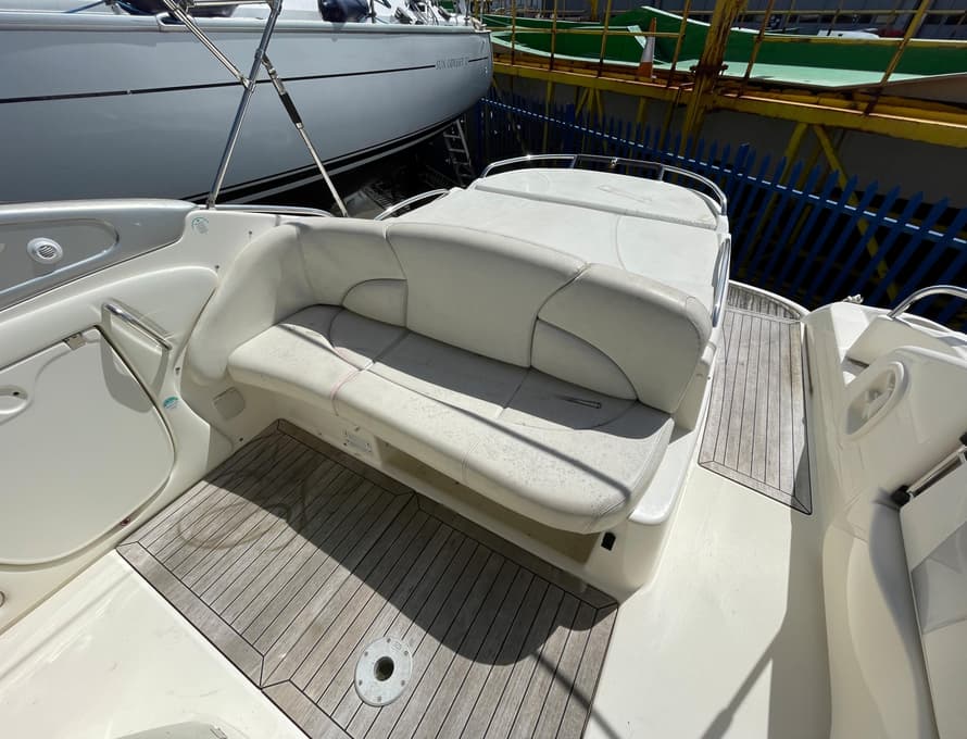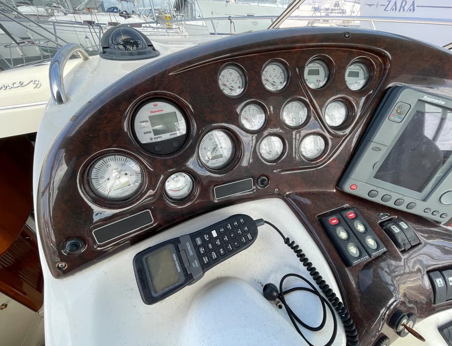 The boat has a GRP hull and teak laid deck and has been wrapped in grey