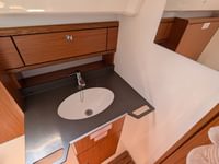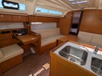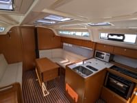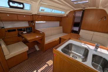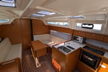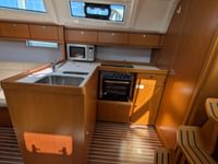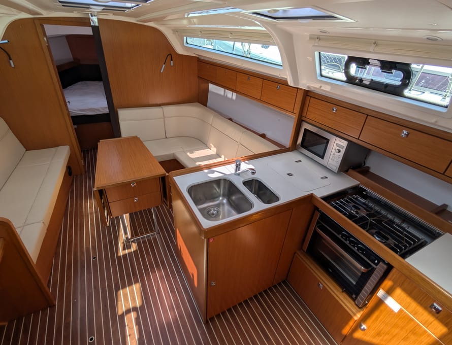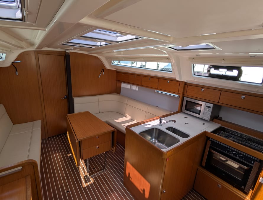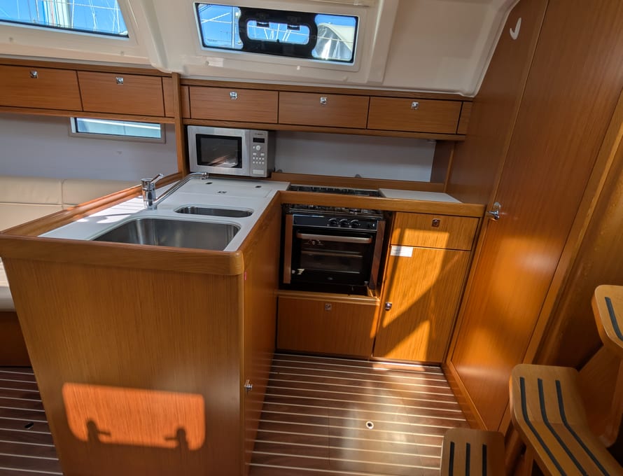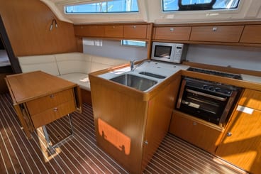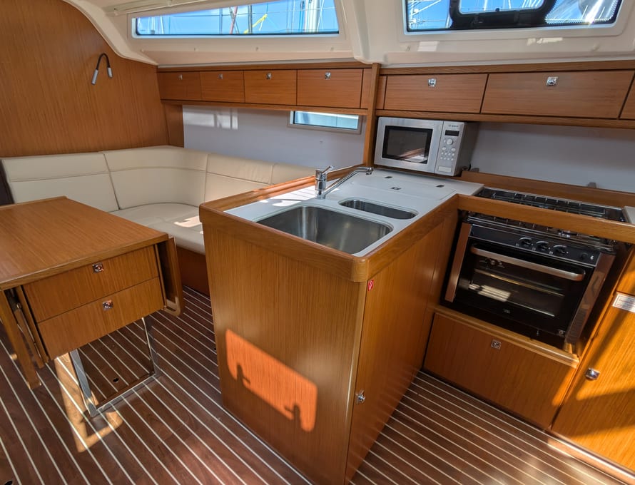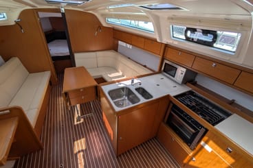 L-shaped galley on starboard aft- White laminated countertop- Gas stove (2 burners and oven)- Double sink- Electric fridge box approx. 147 l- Microwave 230 V