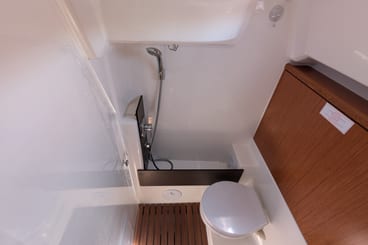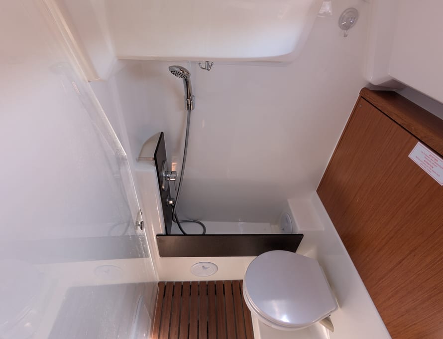 Large heads compartment on port side with sink, electric toilet, and separable shower