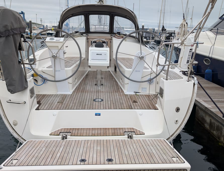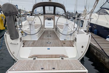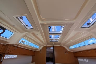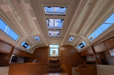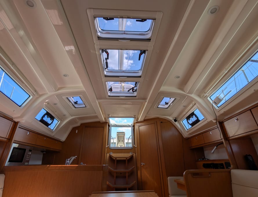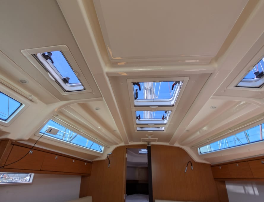she has a spacious and comfortable cockpit with two helms and easy access to the wide, fold-out swim platform, she offers plenty of light and air below deck thanks to her numerous deck hatches, portholes, and coachroof windows.