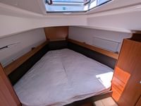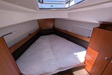Forward cabin with V-shaped double berth, hull windows, deck hatch, cabinets, and shelves on the side walls, with upgraded Mattress