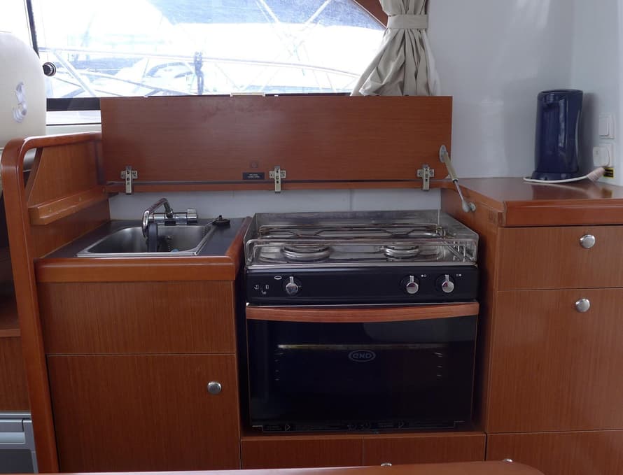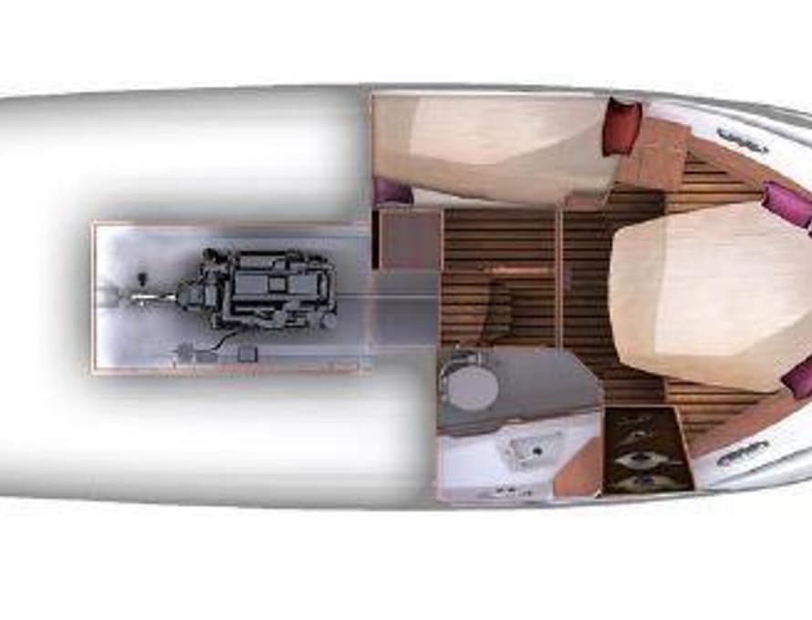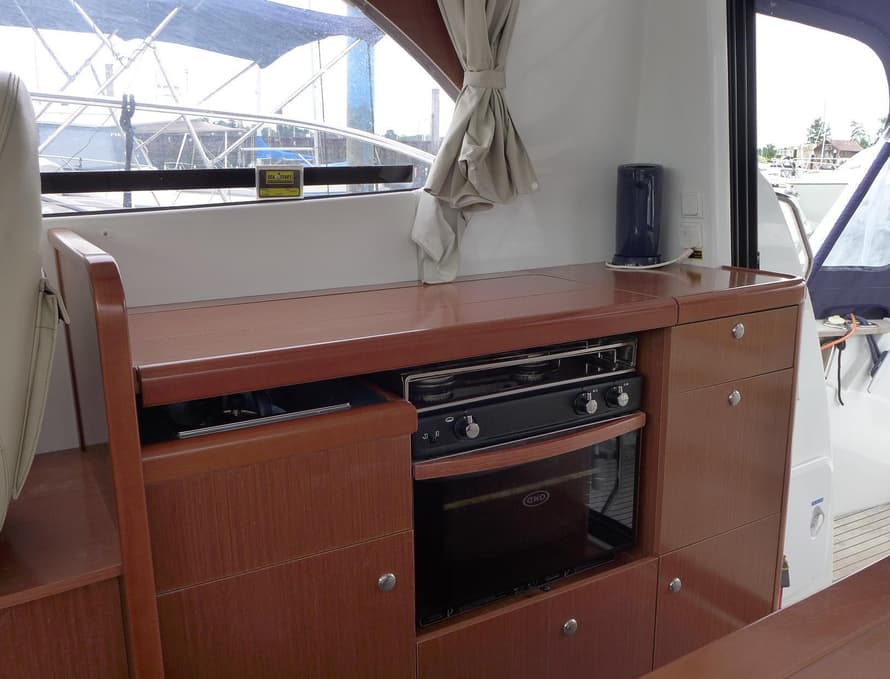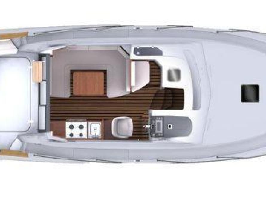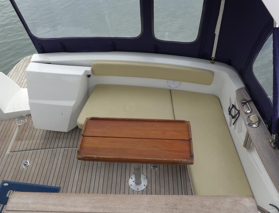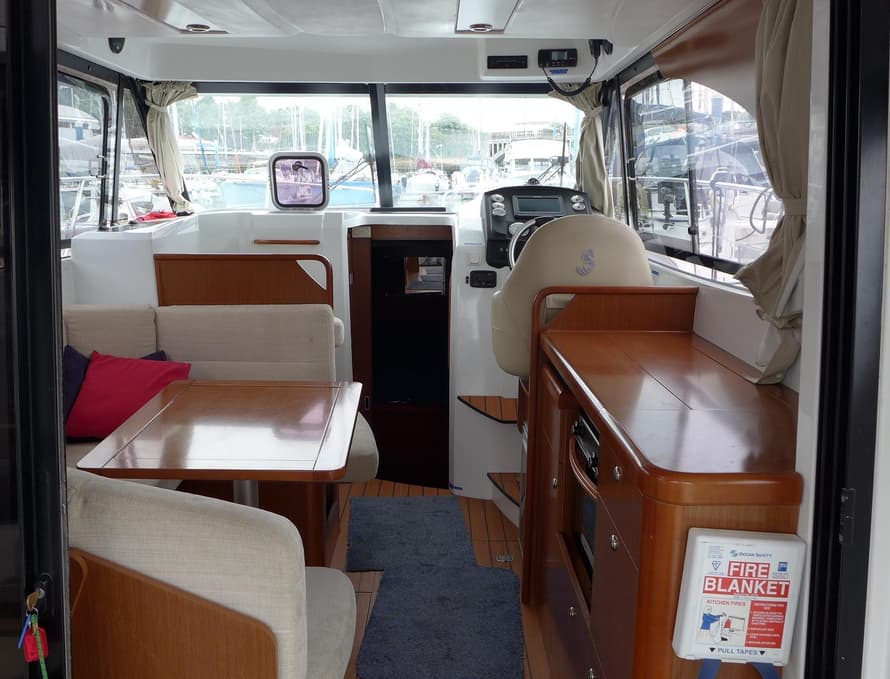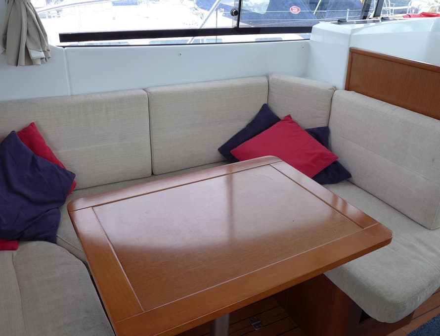 Upholstery in Cream, U-shaped saloon with built-in storage lockers, Saloon convertible to double berth (1.97 m x 1.25 m), Solid wooden saloon table, Co-pilot seat to port, 3 leaved aft window door with black lacquered aluminium frame, Inside curtains (Forward, side windows and aft window door)