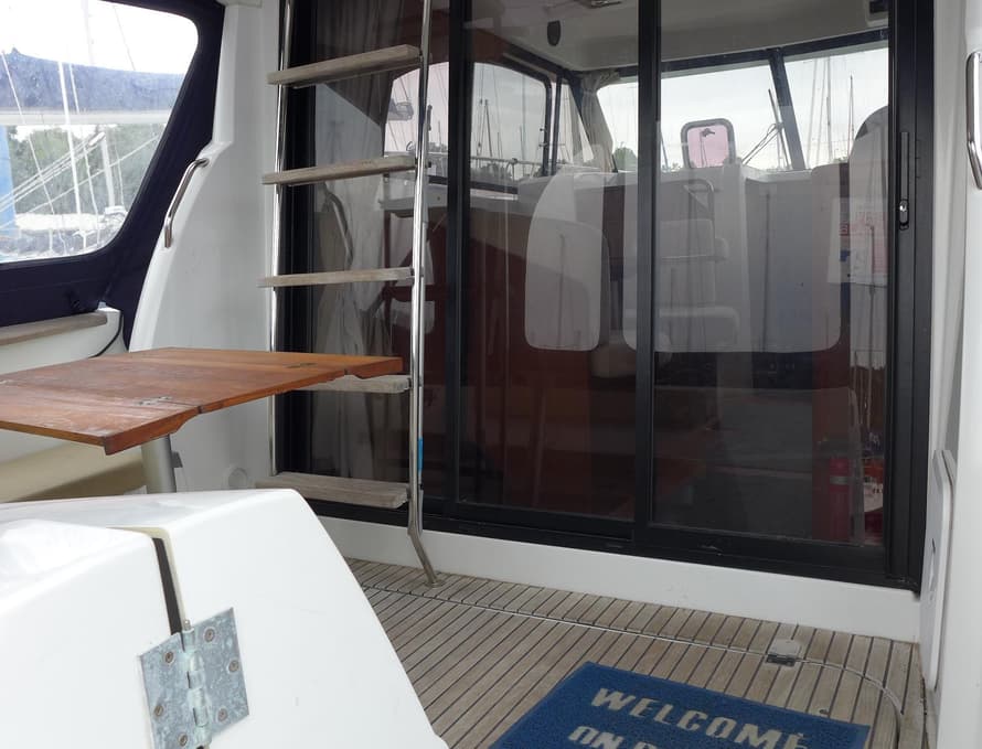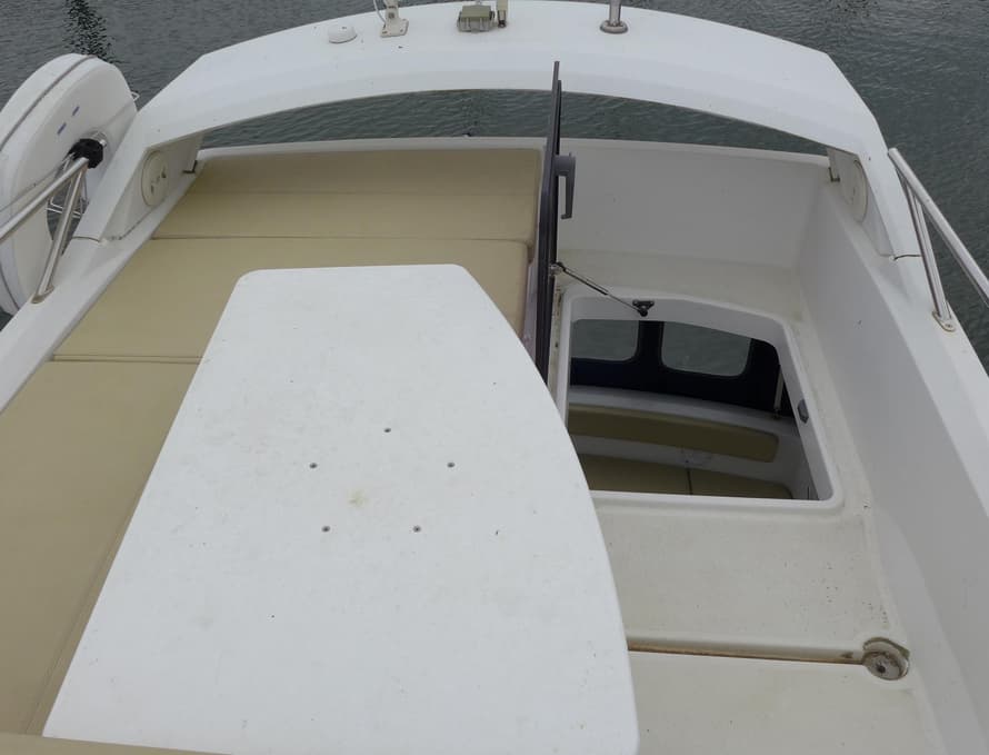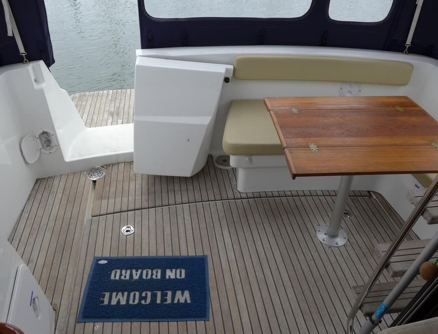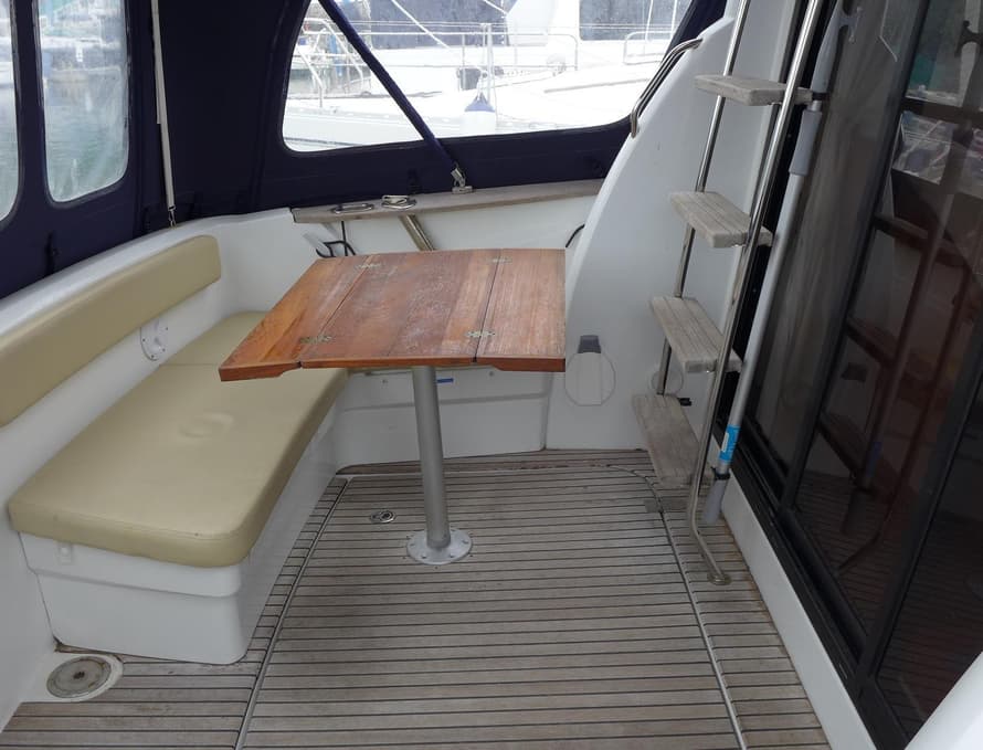 Access ladder with stainless steel uprights and solid wood steps, Grey tinted separating door, Flybridge surrounded by stainless steel pulpit, Polyester hoop bar mounted with navigation lights and other navigation instruments, Flybridge saloon consisting of U-shaped bench seat and a table, convertible into a large 2.30m x 1.25m sundeck, Cushions in PVC upholstery