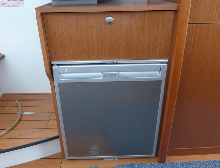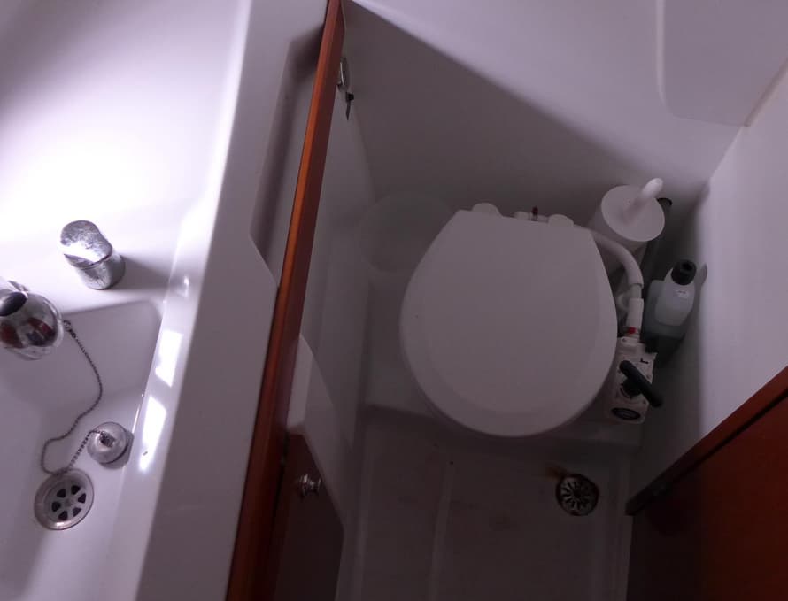 Quiet flush marine toilet with rigid holding tank (88 litres), Washbasin, Chrome taps, Shower, Electric pump for shower draining, Pressurised hot/cold mixer tap, Storage, Mirror, 1 x opening porthole