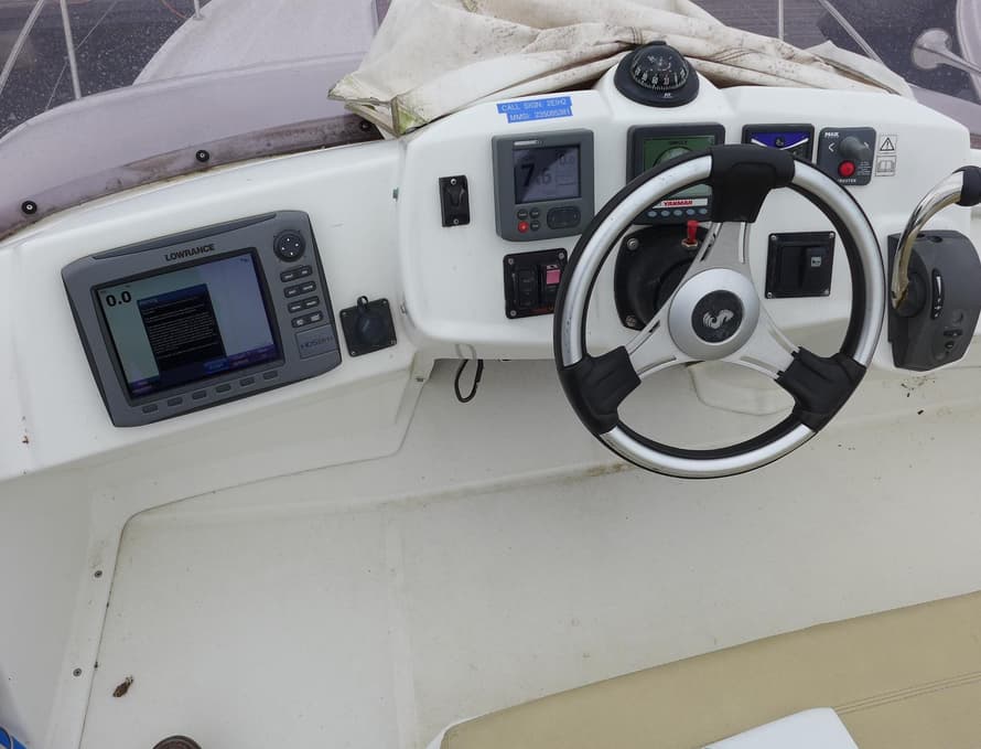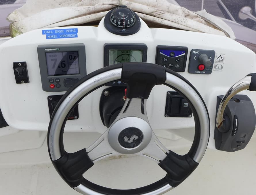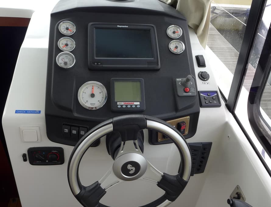 Central steering console, Control panel including electrical engine controls, bow thruster and electric flaps, Sports steering wheel, Hydraulic steering, Fog horn, Pilot seat backrest rotates to complete the saloon, Wheel cover