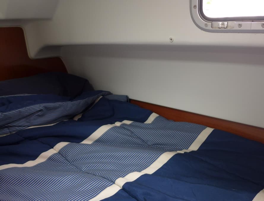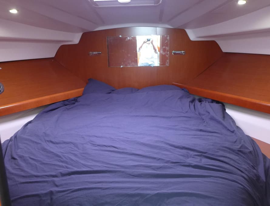 Central double berth (1.98m x 1.40m) with marine mattress, Hanging locker, Storage lockers under berth, 1 x opening deck hatch with fitted mosquito net, 2 x opening hull portholes, Cabin access through sliding door