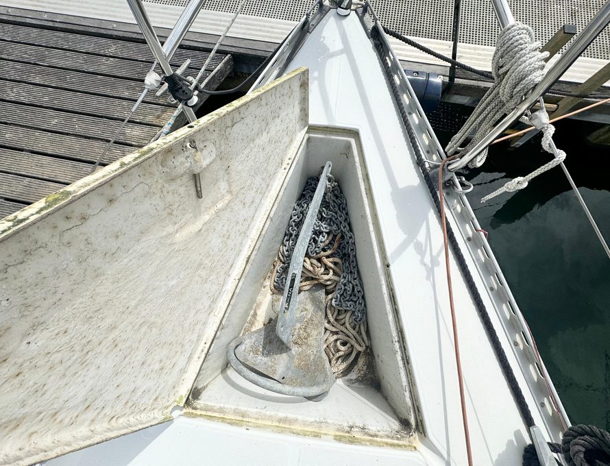 Rocna 10 anchor with chain and warp in anchor locker with bow roller