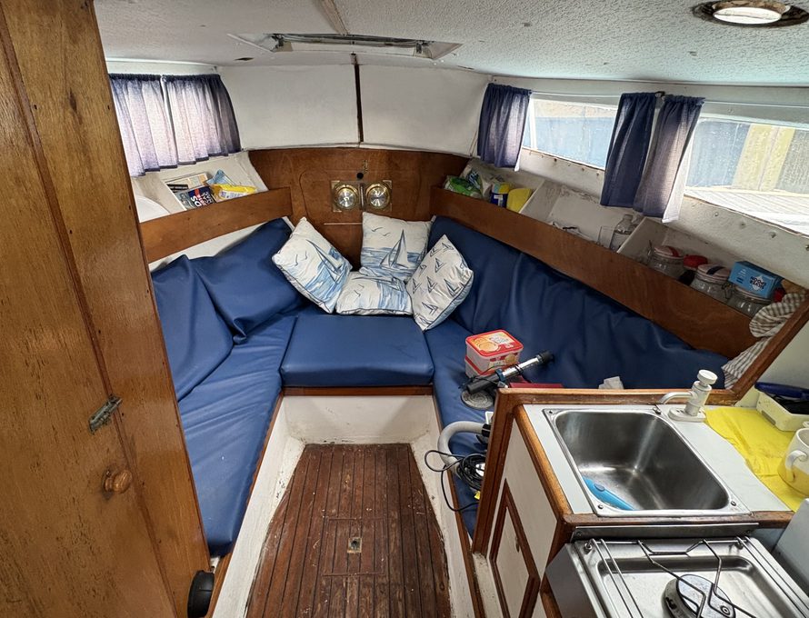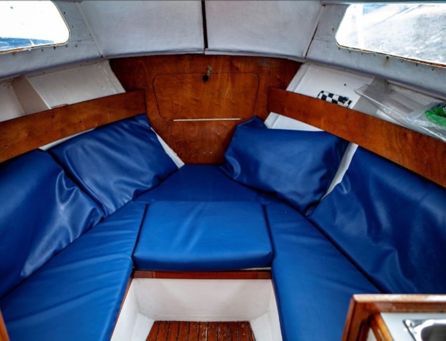 A light main cabin forward with chain and rope locker in the forepeak. 2 berth layout with upholstered cushions and backrests, and storage shelves each side.