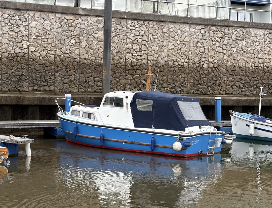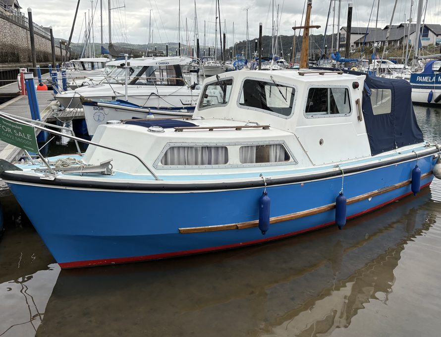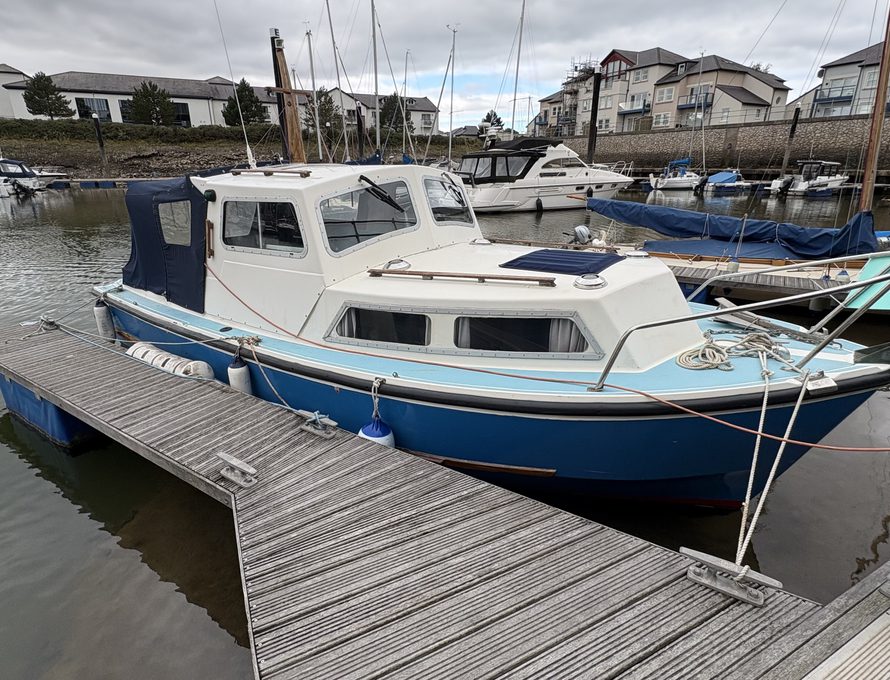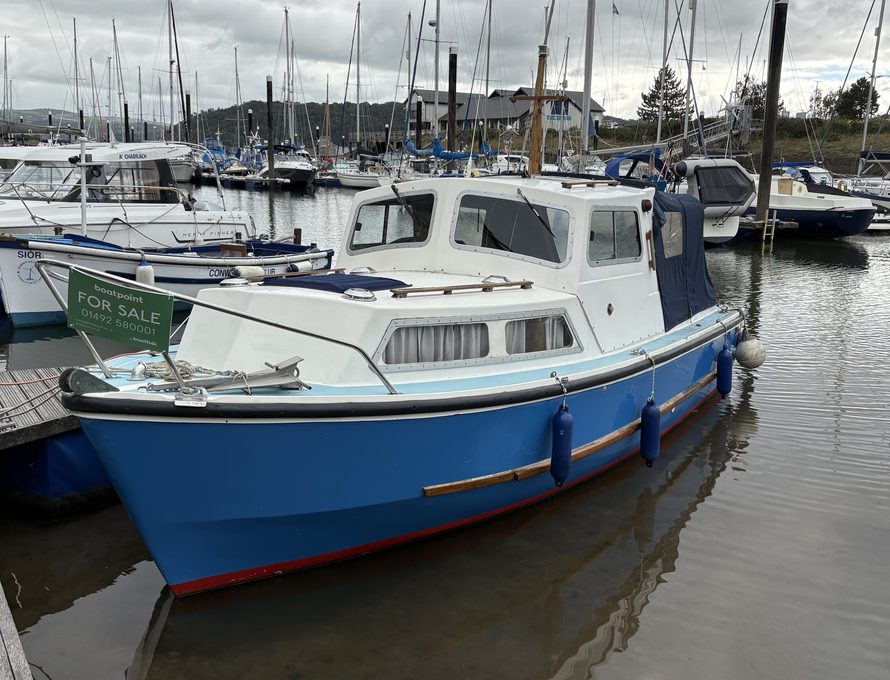 Freedom is a good example of the well renowned Alan Buchanan designed Channel Islands 22. Designed and built as a sturdy motor cruiser with good sea keeping qualities - perfect for weekend cruising. This example is fitted with the larger Ford Mermaid 150hp turbo four diesel engine. She has two single berth which can be converted into a large double berth. Separate heads to port with sea toilet. Galley complete with twin burner gas cooker, grill and stainless steel sink. Electronics include GPS Plotter, Echo Sounder and VHF, and comes complete with beaching legs. Lying Deganwy Marina, North Wales. Viewings by appointment with boatpoint Conwy - 01492 580001