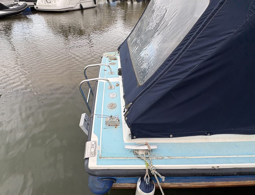 Blue GRP semi-displacement hull with white GRP superstructure with non-slip surfaces to decks. (Topsides professionally painted in 2024)