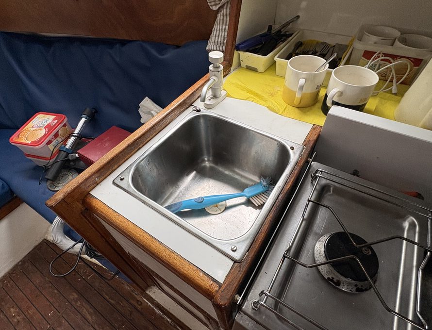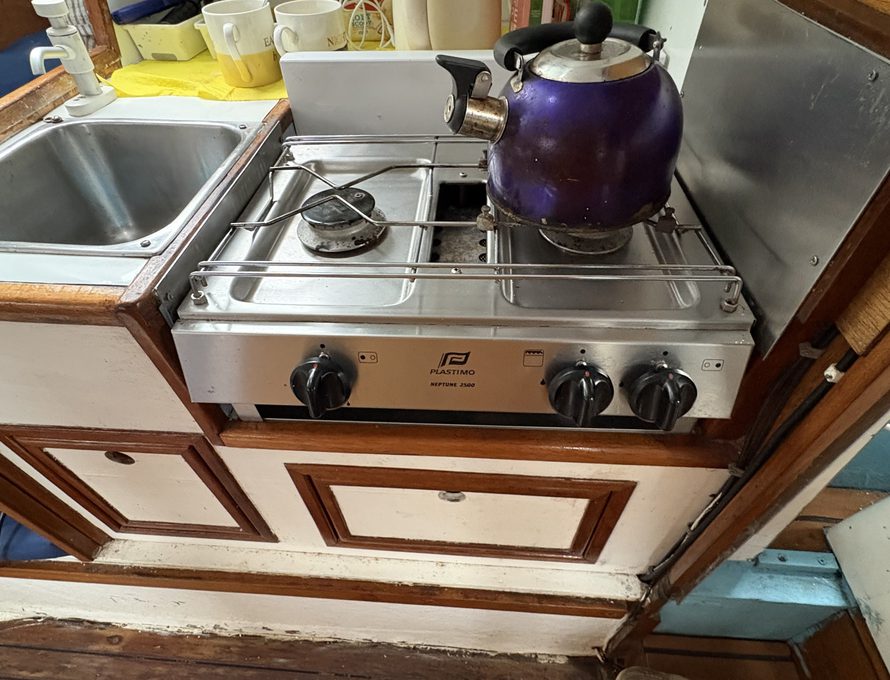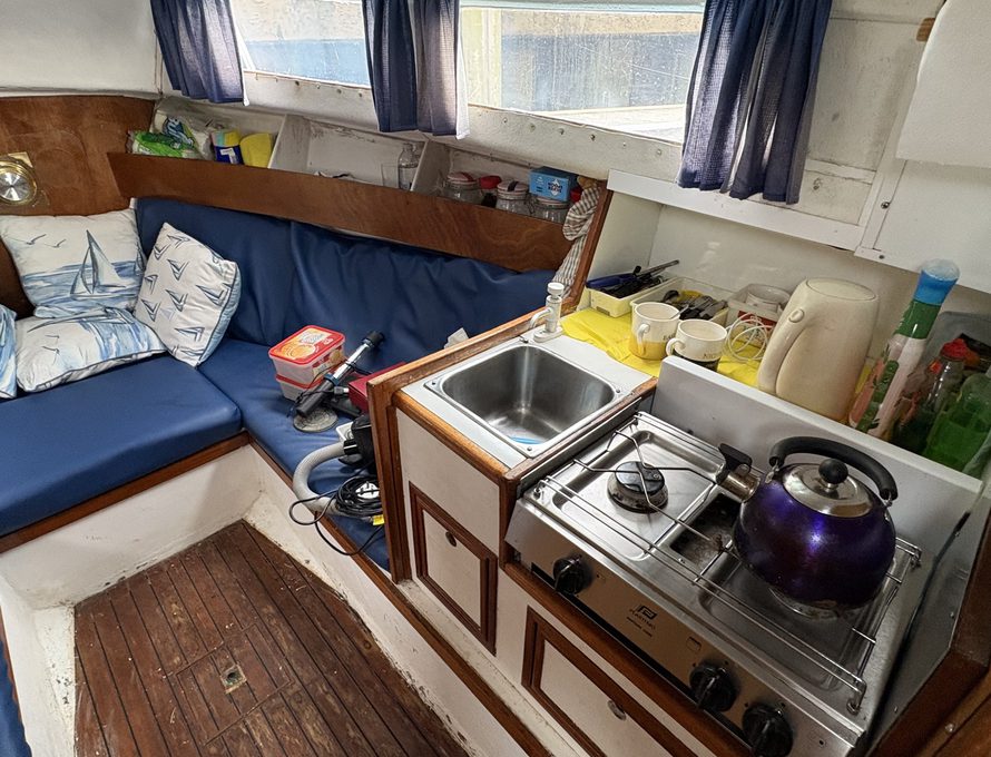 Galley to starboard with Plastimo 2500 2-burner gas hob with grill (2009) and sink with manually pumped cold water system, and storage lockers.