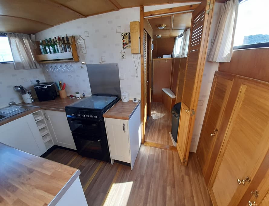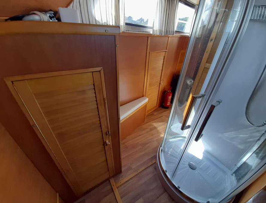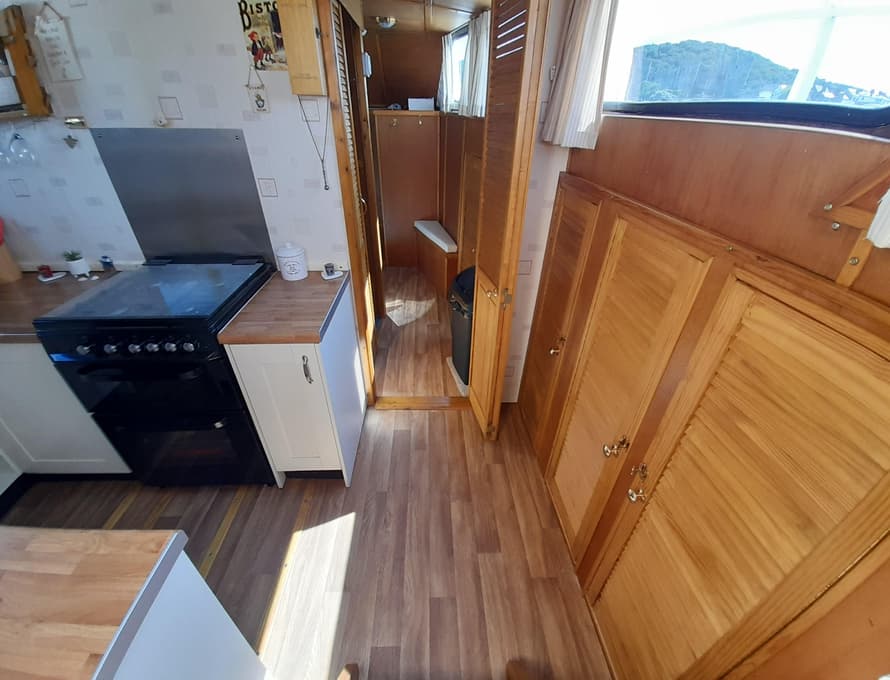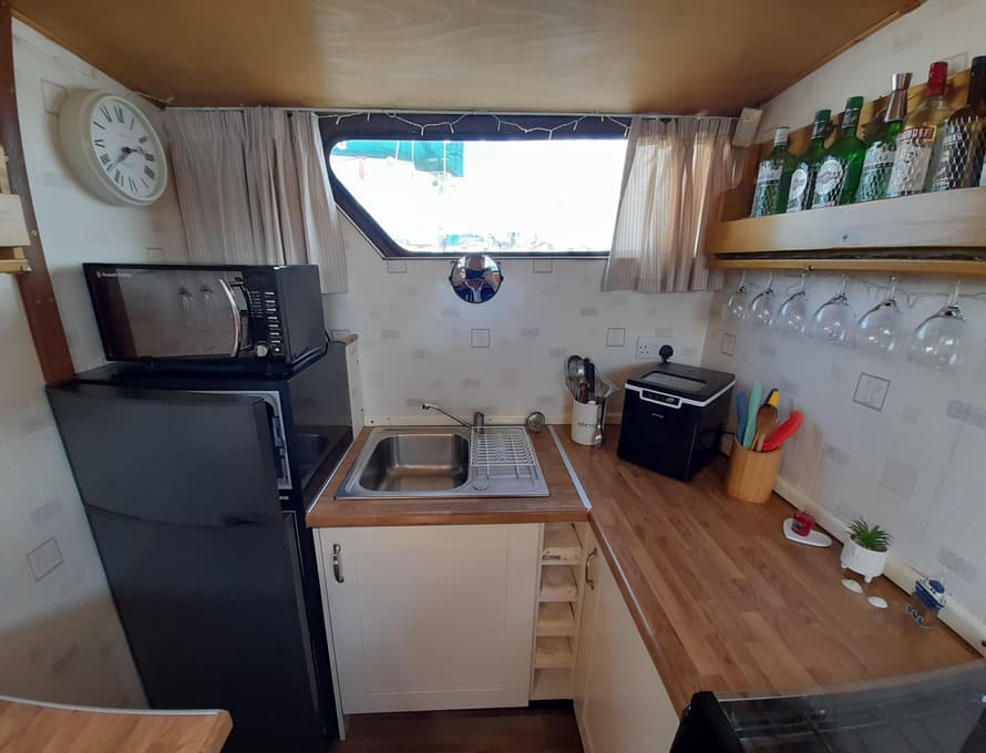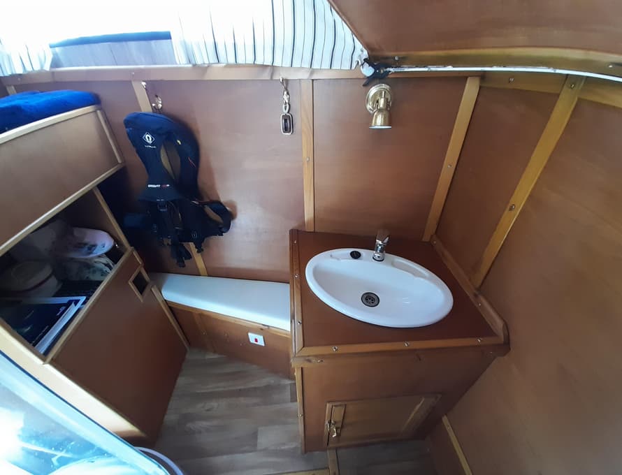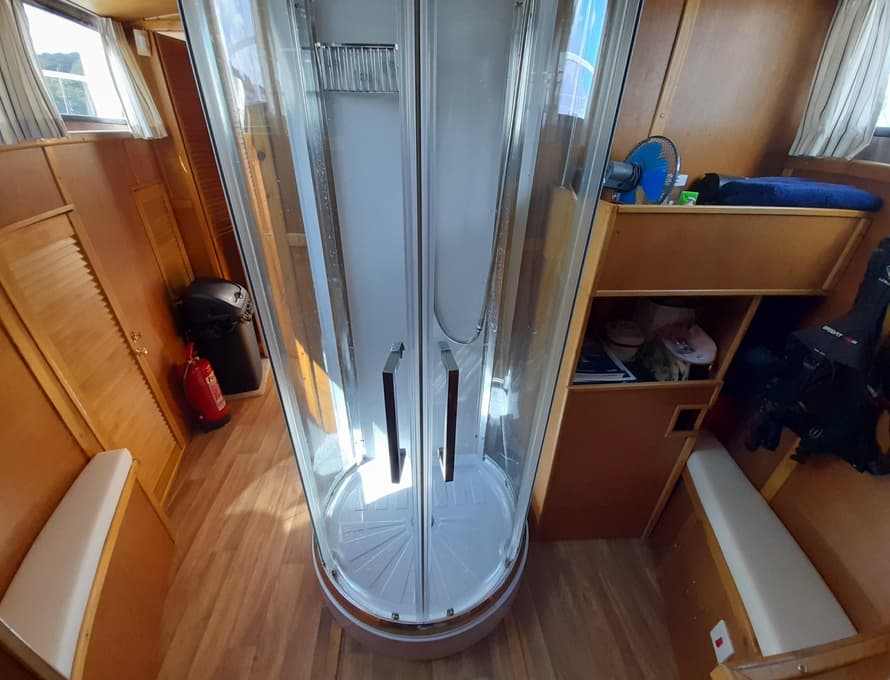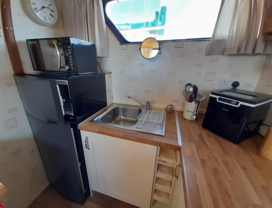 From forward aft; forward compartment with circular framed shower cubicle and washbasin plus storage. A single berth cabin aft to port with TV. A well-appointed and good-sized galley immediately behind to port with fridge/freezer (Operates on gas/12v/ or 240v), 4 burner gas stove, oven, and grill, stainless steel sink with pressurised hot and cold water, portable ice-maker, microwave, and cupboard units.