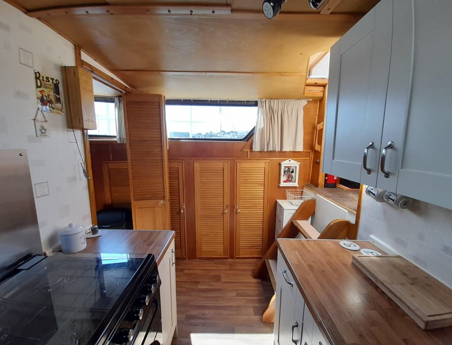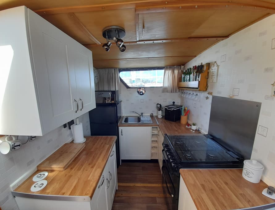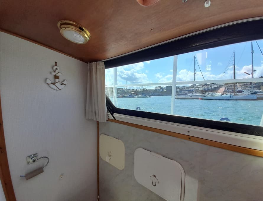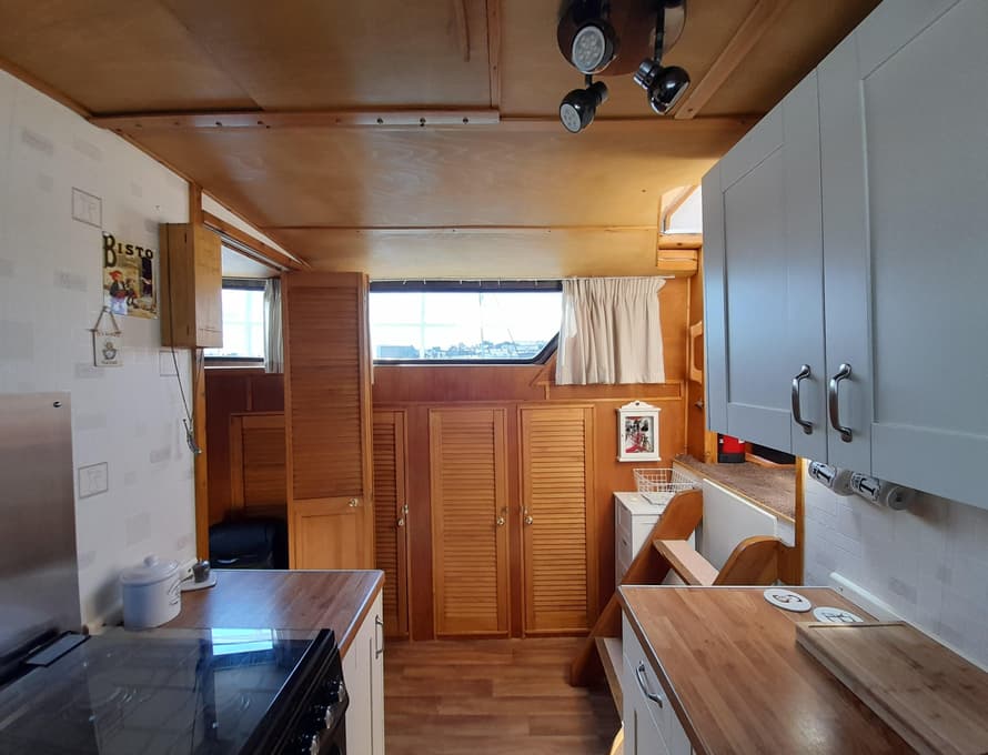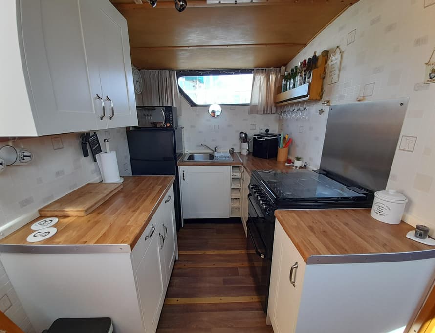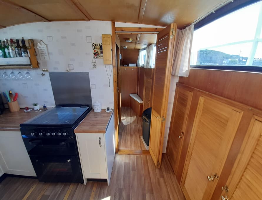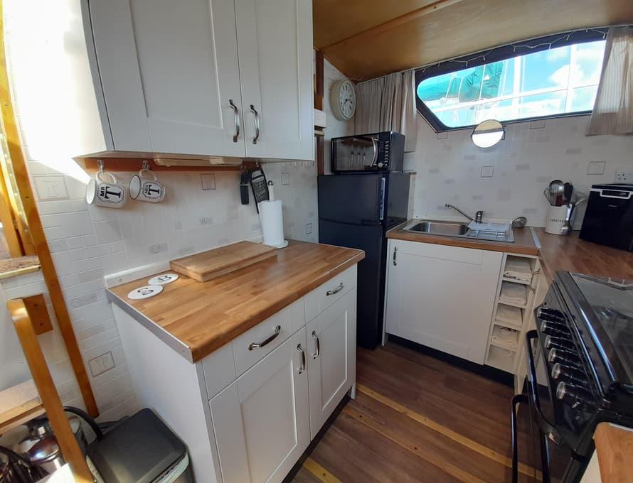 From forward aft; forward compartment with circular framed shower cubicle and washbasin plus storage. A single berth cabin aft to port with TV. A well-appointed and good-sized galley immediately behind to port with fridge/freezer (Operates on gas/12v/ or 240v), 4 burner gas stove, oven, and grill, stainless steel sink with pressurised hot and cold water, portable ice-maker, microwave, and cupboard units.