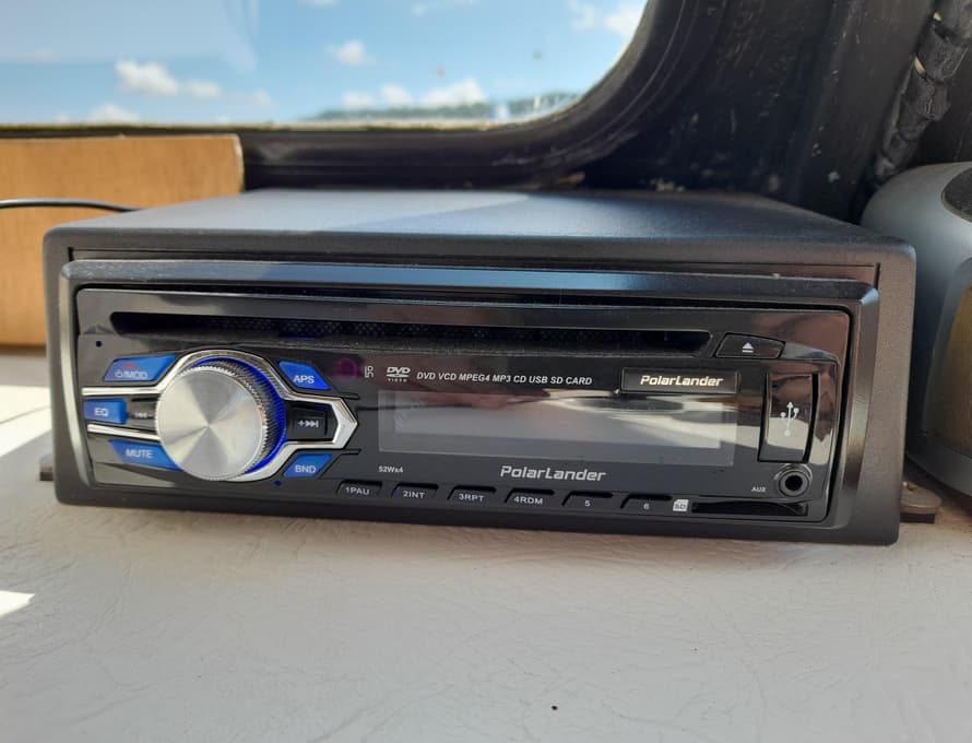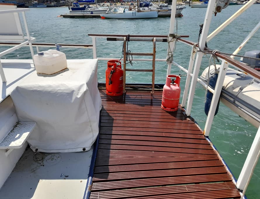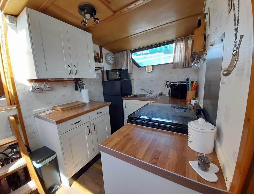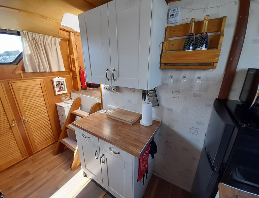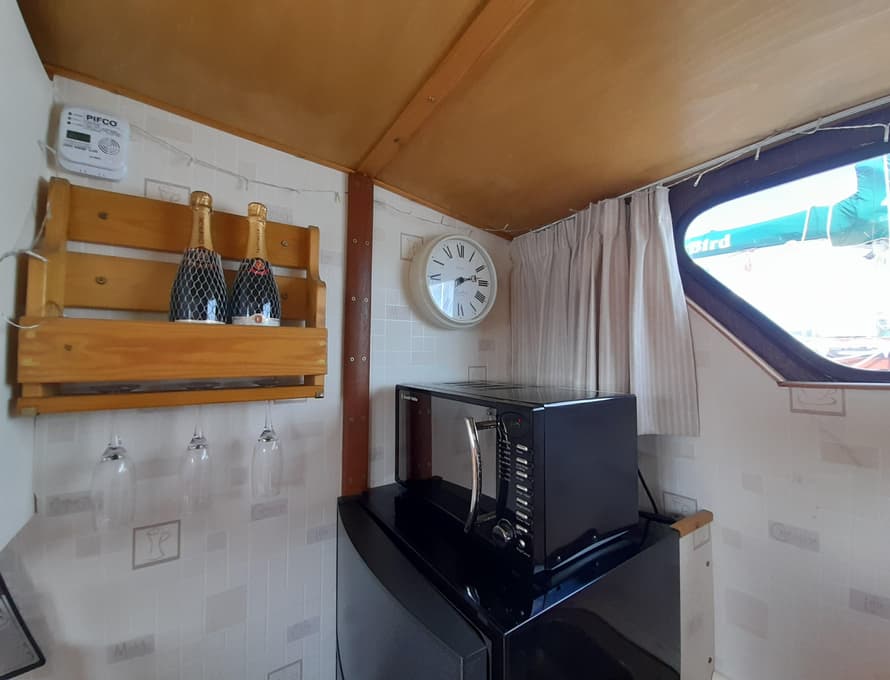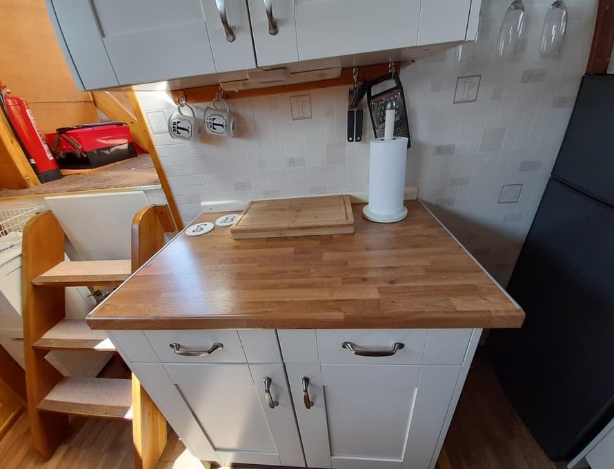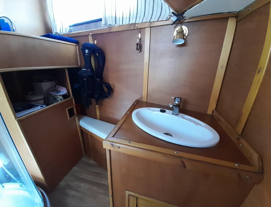 From forward aft; forward compartment with circular framed shower cubicle and washbasin plus storage. A single berth cabin aft to port with TV. A well-appointed and good-sized galley immediately behind to port with fridge/freezer (Operates on gas/12v/ or 240v), 4 burner gas stove, oven, and grill, stainless steel sink with pressurised hot and cold water, portable ice-maker, microwave, and cupboard units.