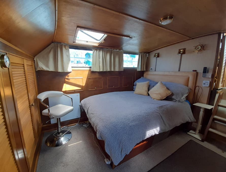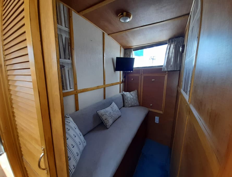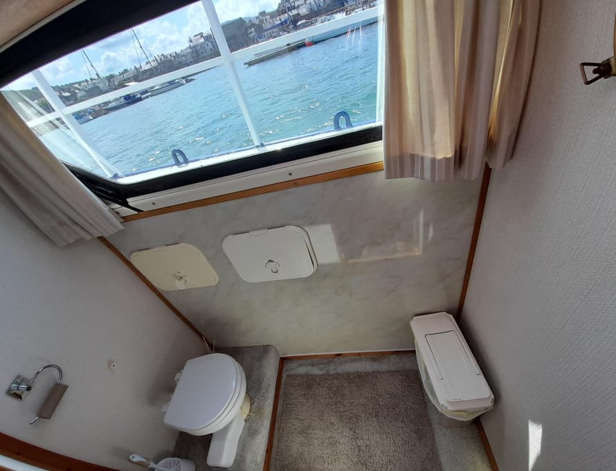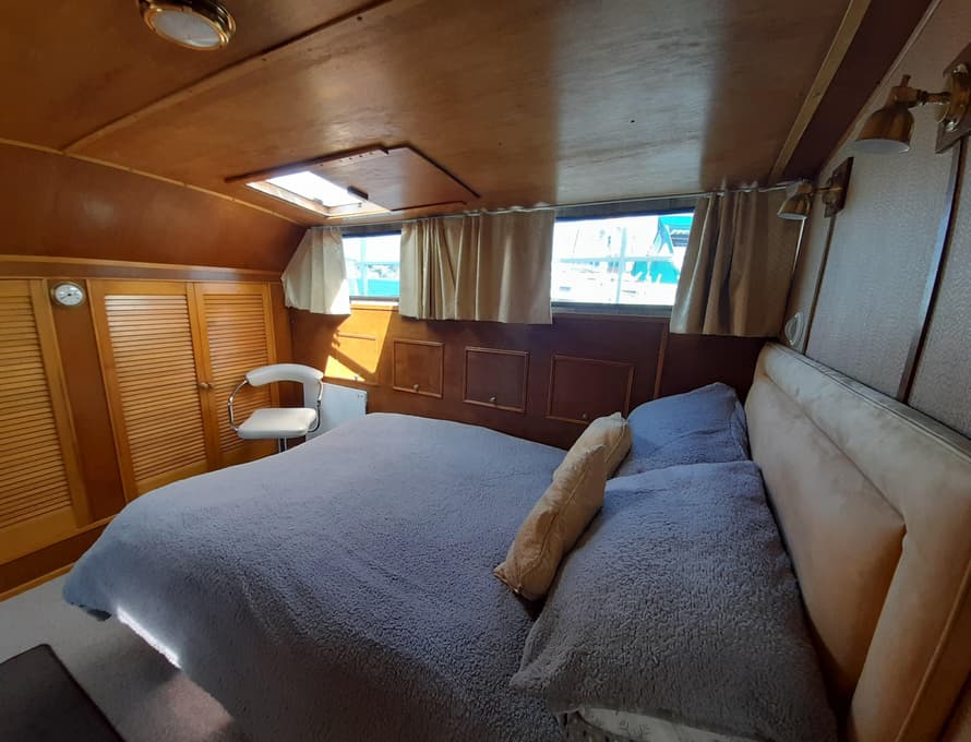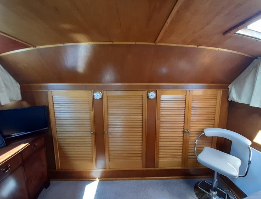 Steps lead down into the aft cabin which contains a double berth to port, an enclosed head compartment to starboard, and wardrobes across the aft end. Good quality carpet and underlay. TV + DVD. Inverter.