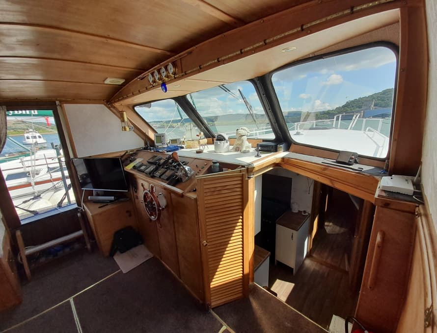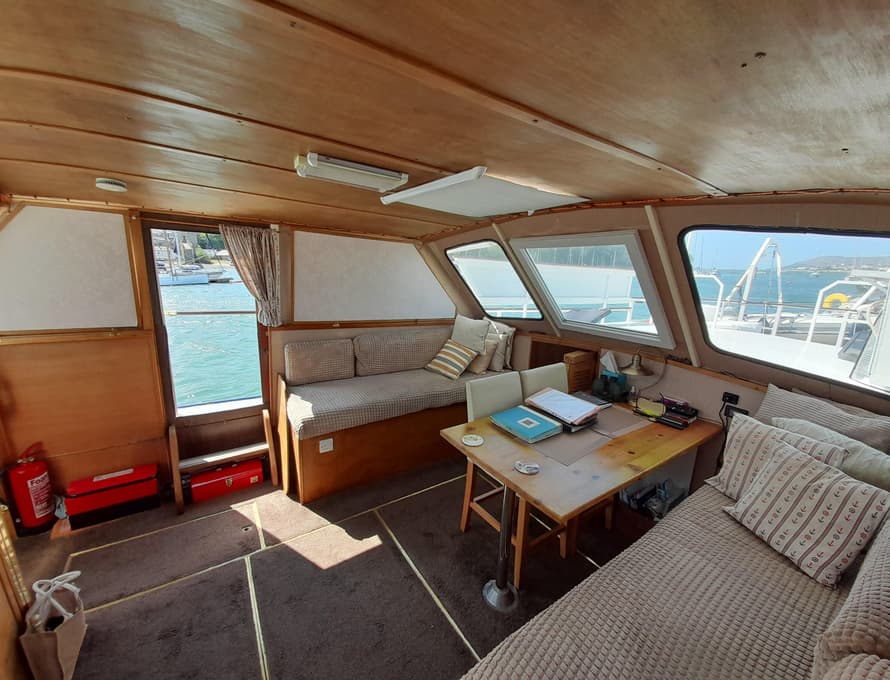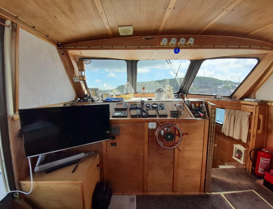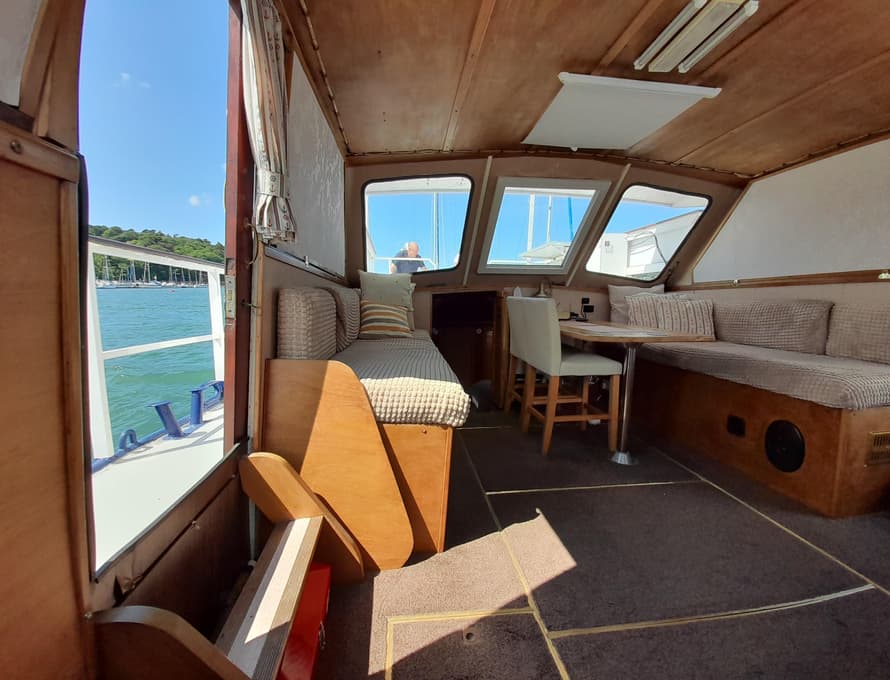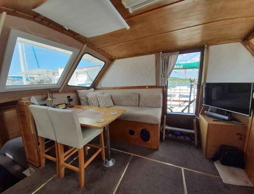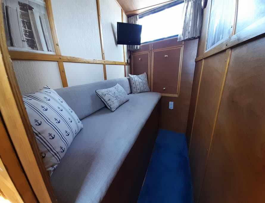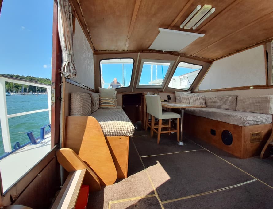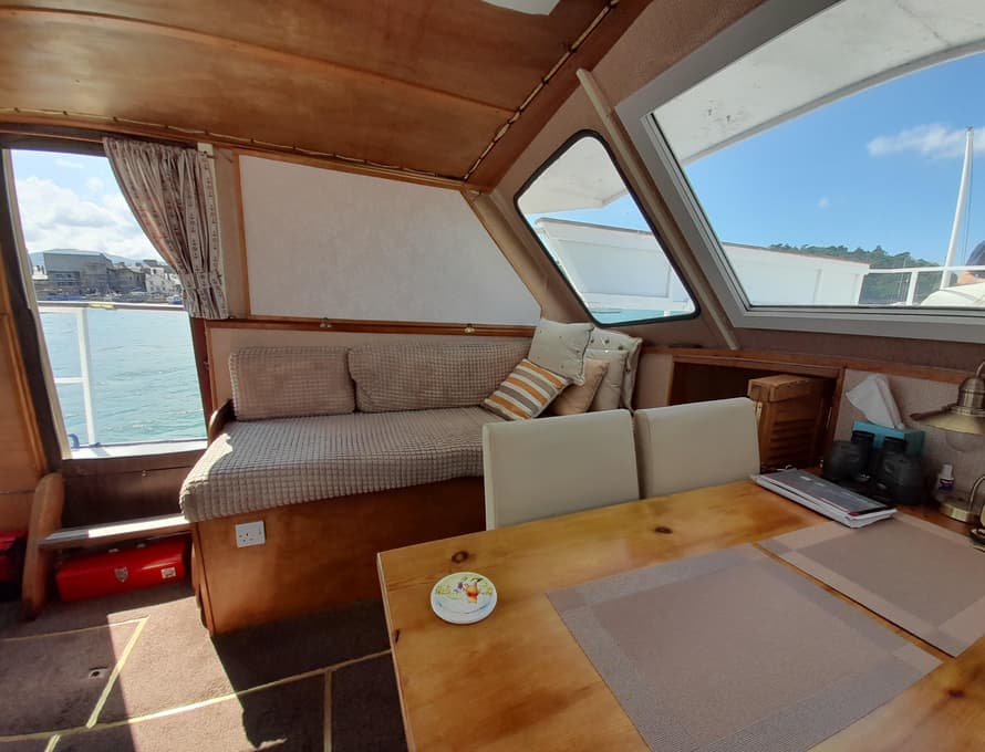 Steps lead up to the deck saloon/wheelhouse, which has the steering position to forward and settees/single berths along each side, and a central saloon table with chairs. Good quality carpet with well-insulated underlay. Smart TV + DVD