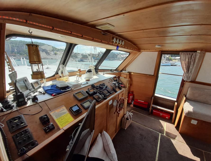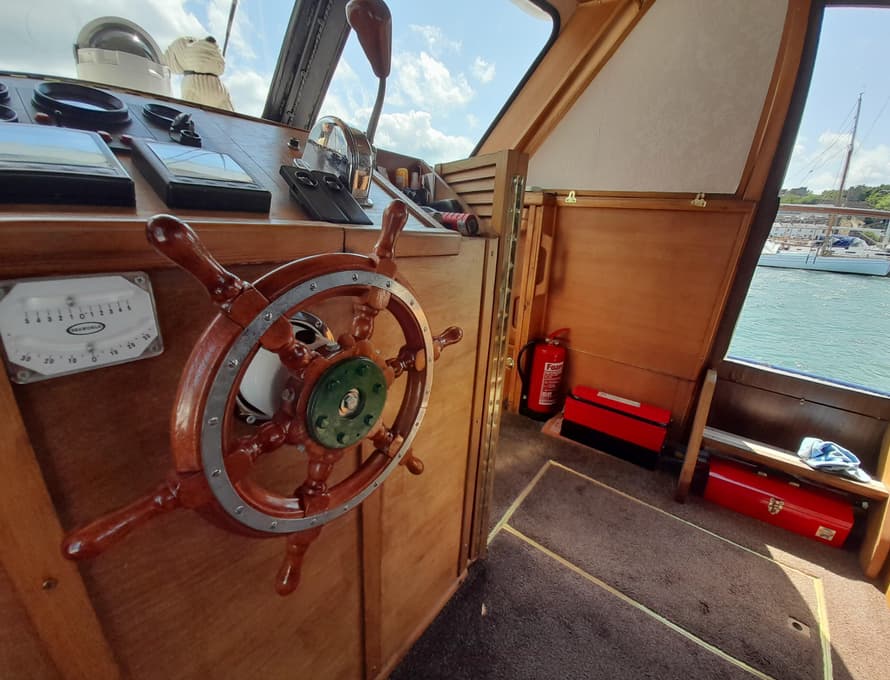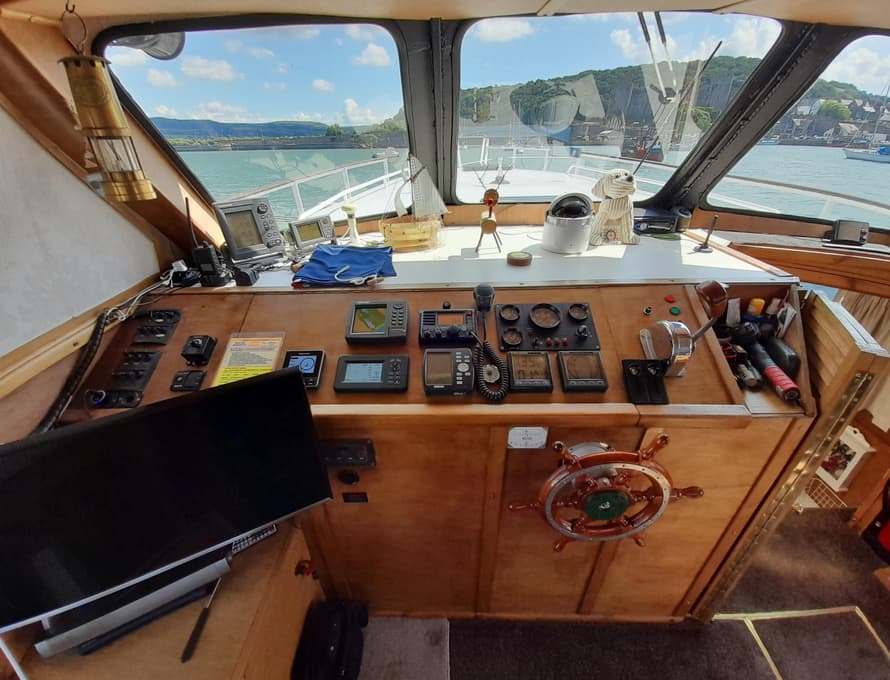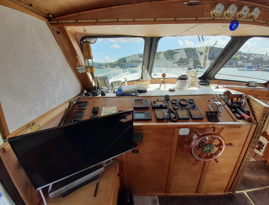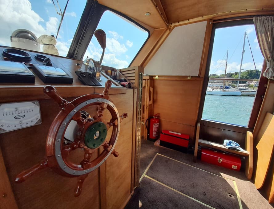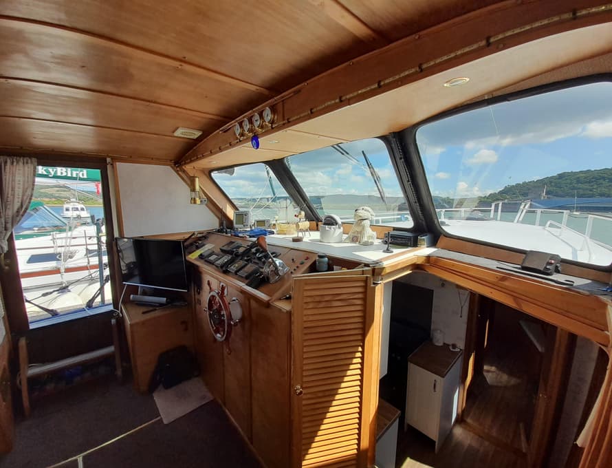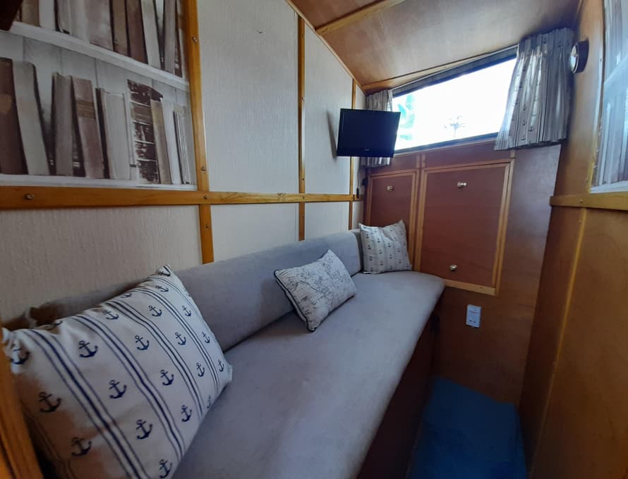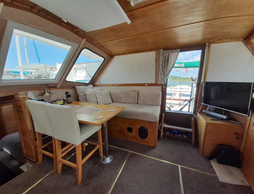 Steps lead up to the deck saloon/wheelhouse, which has the steering position to forward and settees/single berths along each side, and a central saloon table with chairs. Good quality carpet with well-insulated underlay. Smart TV + DVD