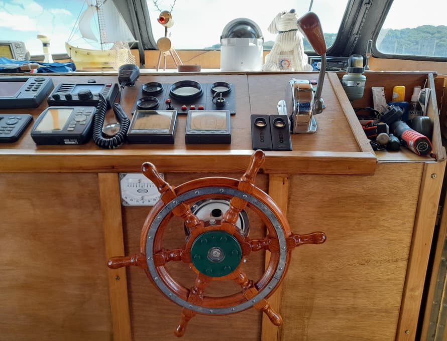 Balanced steel rudder supported by a bronze bearing in the skeg extending from the keel. The steering system is new Vetus hydraulic system.