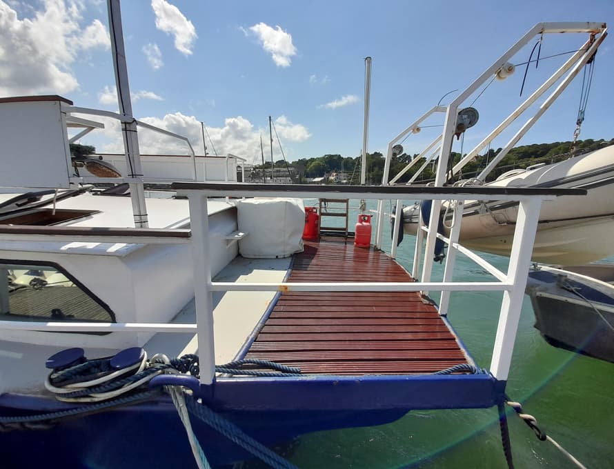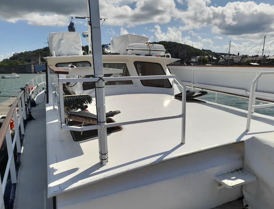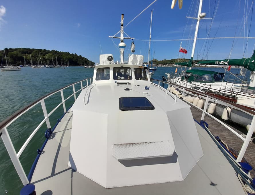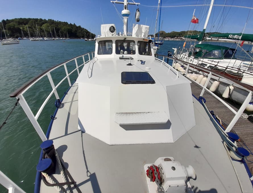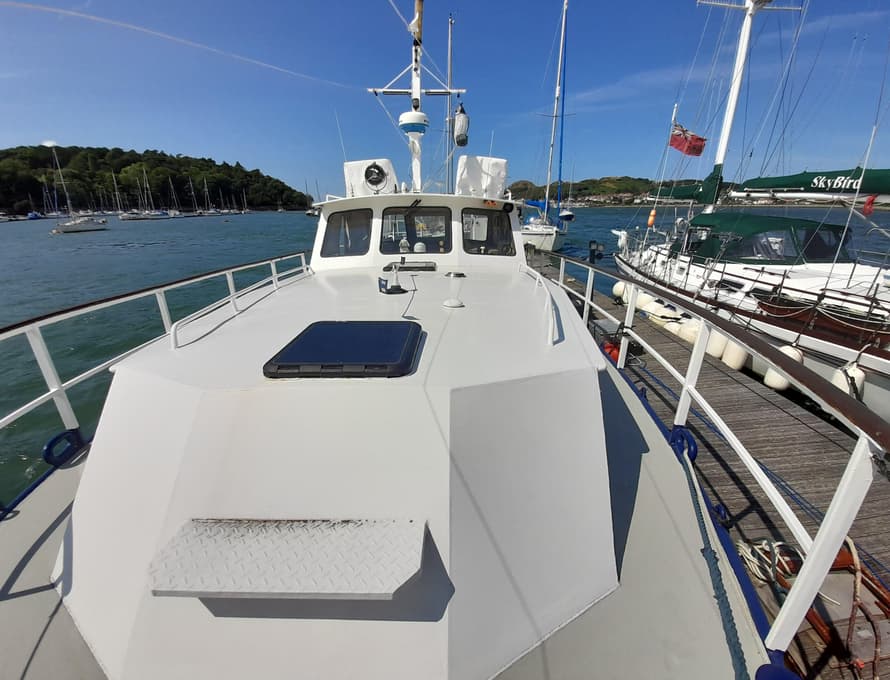 As part of the restoration, all deck plating was renewed in 4mm plate, welded to an original external margin inboard at the gunwale, and newly formed steel angle at the base of the coachroofs and deck saloon. The front face of the forward cabin and sections of its roof has been replaced, also the entire aft cabin structure and sections of the deck saloon sides. The foredeck beams were replaced in steel angle, and box section steel was welded to the side deck beams for reinforcement. All parts of the structure have been grit blasted and epoxy primed.