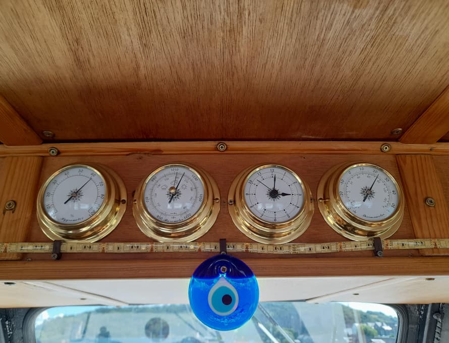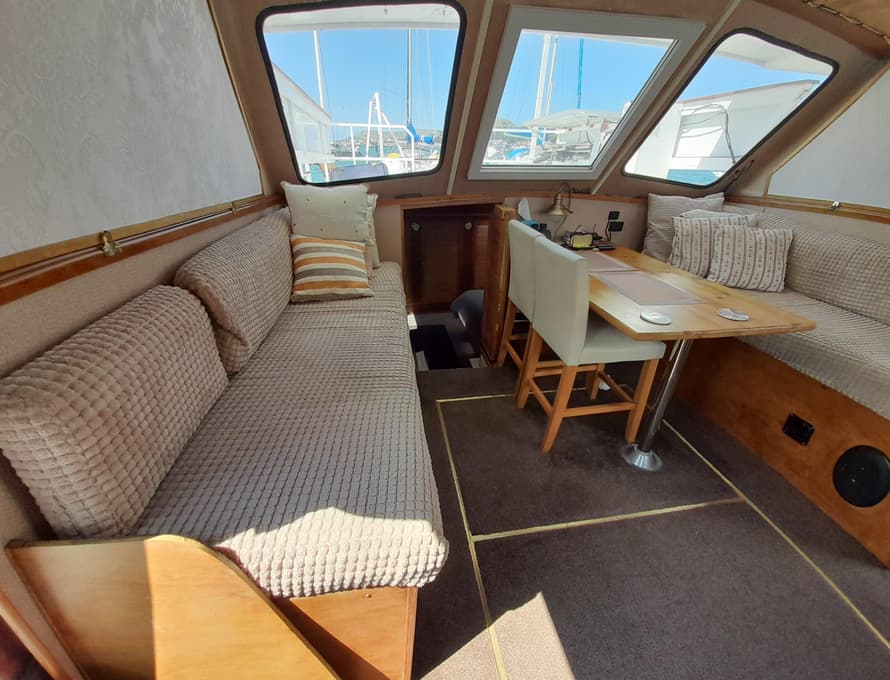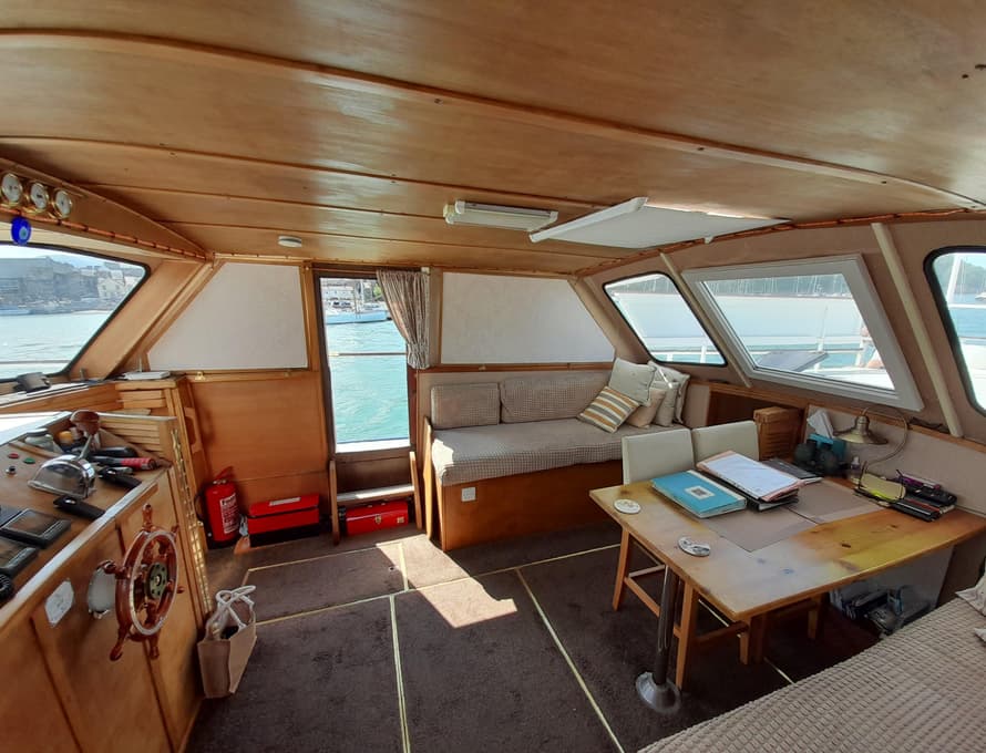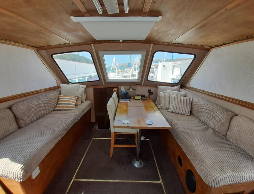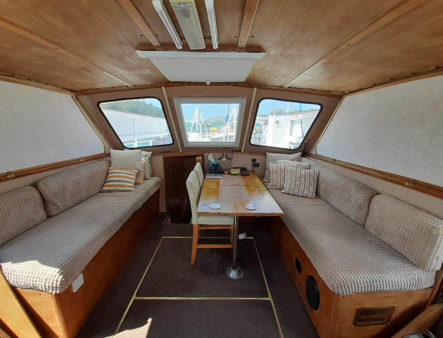 The furniture is constructed from satin-finished marina plywood and oak, with some fabric facings. All side coamings/walls and ceilings are covered in marine plywood panels.