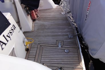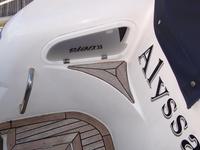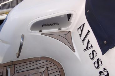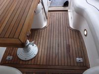 The topsides are a high gloss white in super condition. Black coveline striping and solid block at rear enhance the sporty look. Large, inset portholes to port and starboard. Hull to superstructure mouldings are covered in a stainless steel band. Teak laid bathing platform incorporated into hull moulding. Bathing ladder in hinged locker. Dinghy davits with Honwave tender. Electric passerelle.