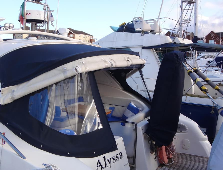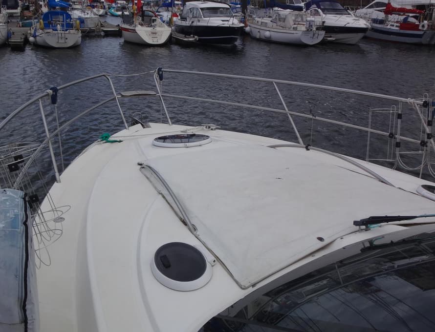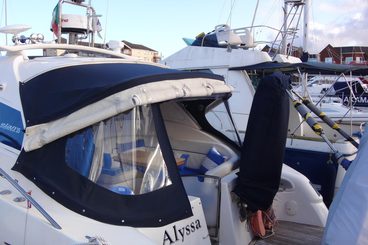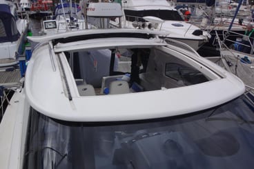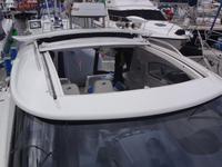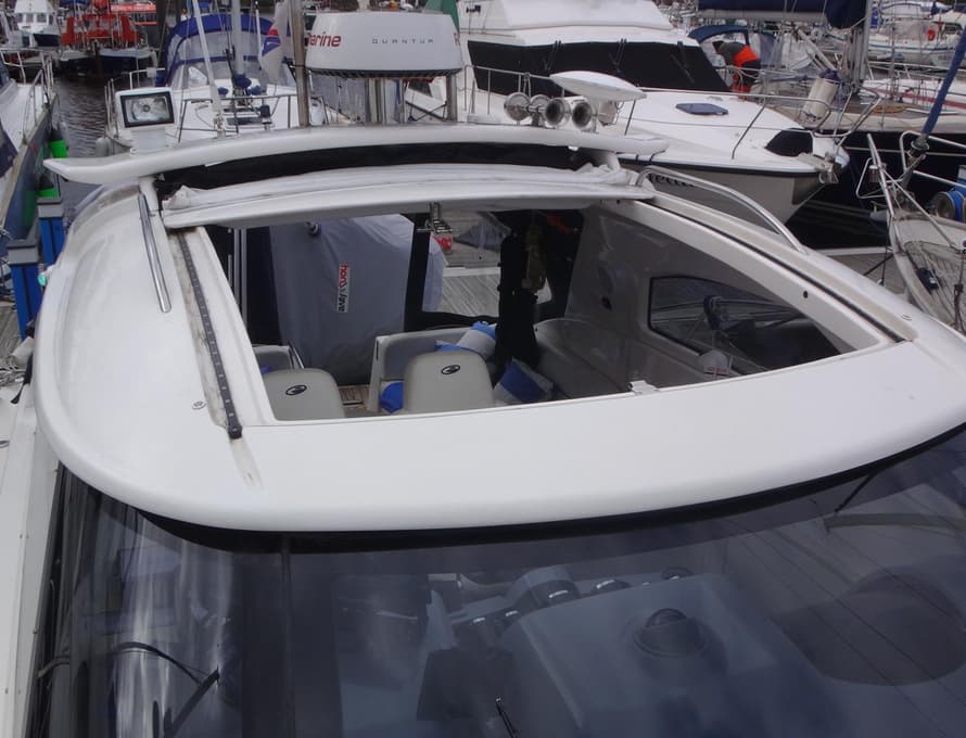 Concertina style PVC sliding sunroof with protective cover. Rear GRP radar and instrument arch with remote spotlight and TV aerial.