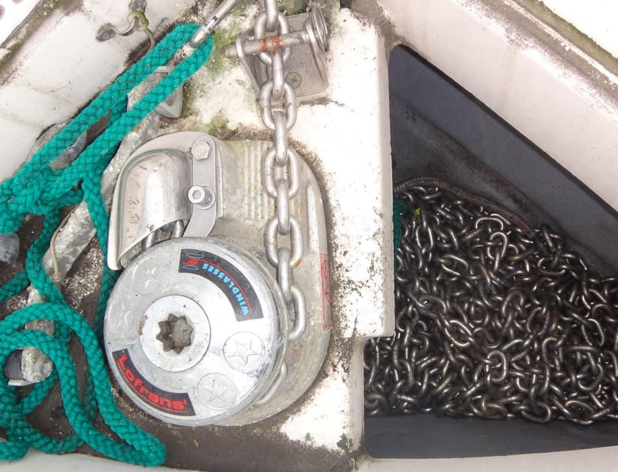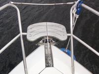 self bailing anchor locker with Lofrans electric windlass. Stainless steel bow fitting with roller and protective bow plate. Teak step incorporated into bow rail for easy access when moored Mediterranean style.