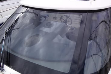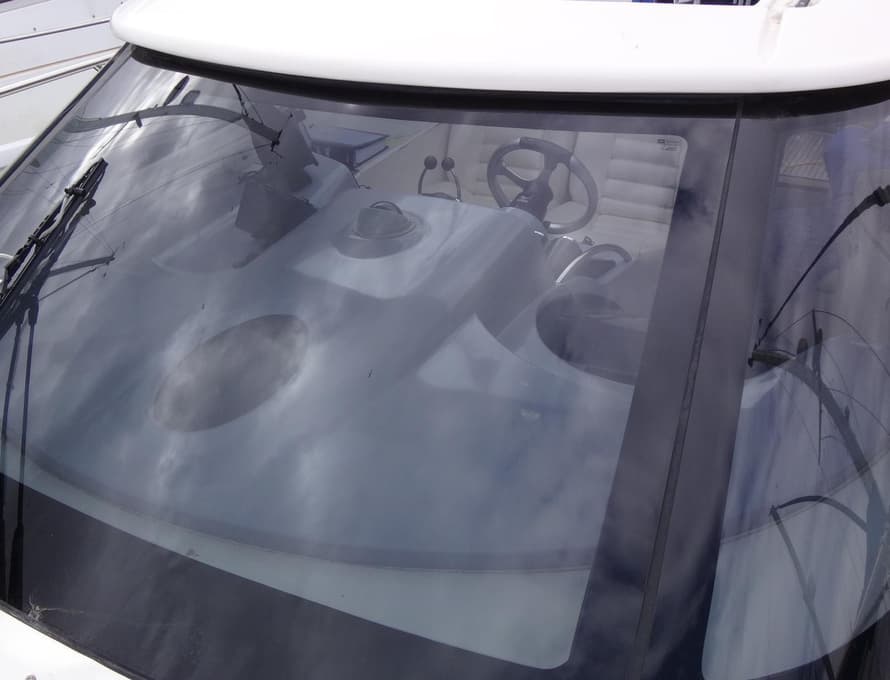 Tinted, toughened glass wrap around windscreen with central pantographic windscreen wiper. Windscreen and side windows have exterior protective covers.
