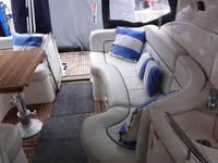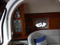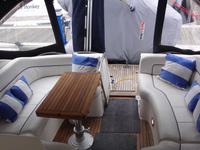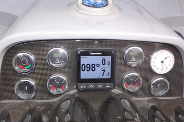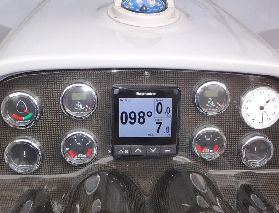 Vessel is powered by twin Volvo Penta D4-260 diesel inboards with EDC controls and fly-by-wire throttles. Volvo DP sterndrives with bronze G7 propellers. The vessel will cruise happily at 25 knots burning a respectable 14.4 gph@3000 rpm. Top speed should you desire and the conditions allow is a heart stopping 37 knots. The engine bay is situated at the rear of the cockpit and accessed via an electrically operated engine hatch. This allows access for servicing and daily checks. The driving position is central which gives the helmsman a far greater perspective when under way. The co-pilot position is to starboard with dedicated chart area. Sporty carbon fibre dashboard with full engine instrumentation. The dashboard moulding is grey which minimises glare.