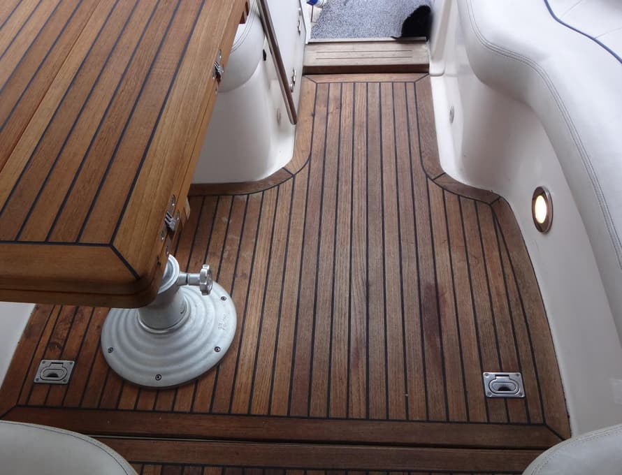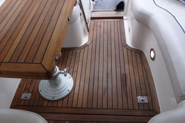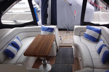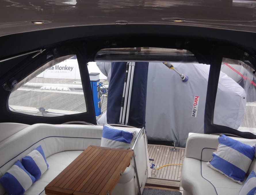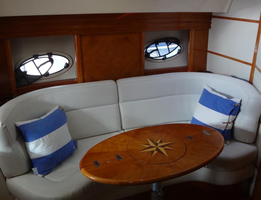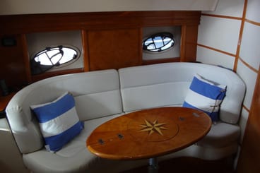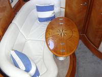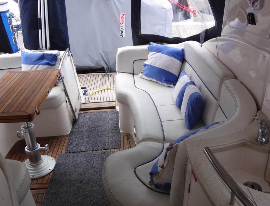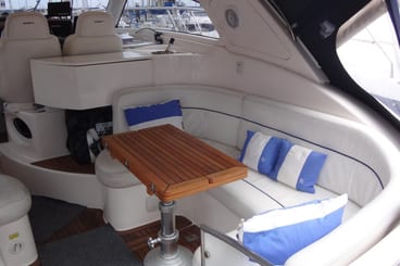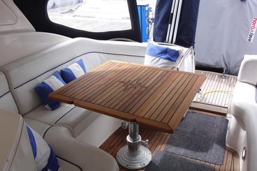 Clearly defined cockpit with teak laid sole. U-shaped seating area to port with upholstered bench cushions and backrests. Central table which drops down if required to make a large sunpad or to provide a comfortable overnight berth for an unannounced guest. Opposite is a comfortable chaise longue.