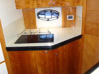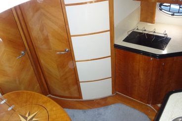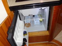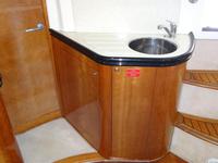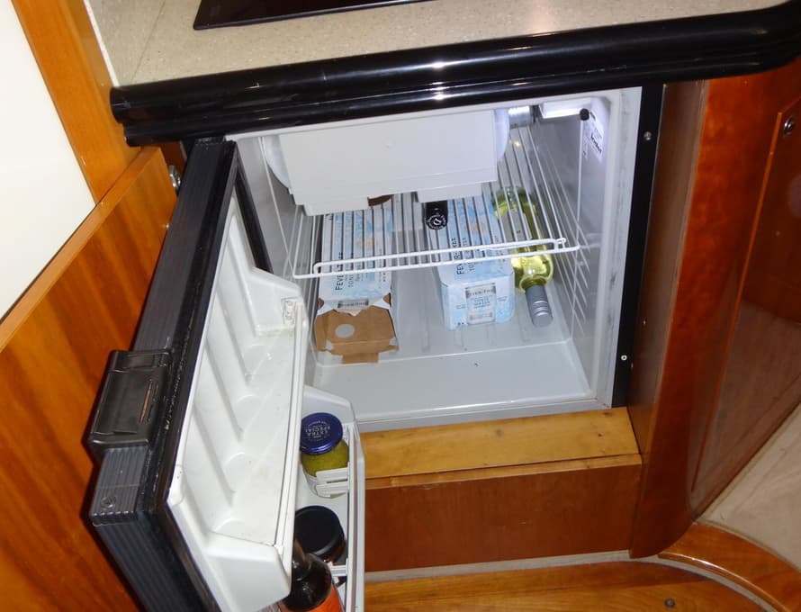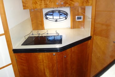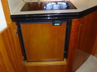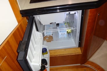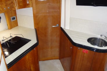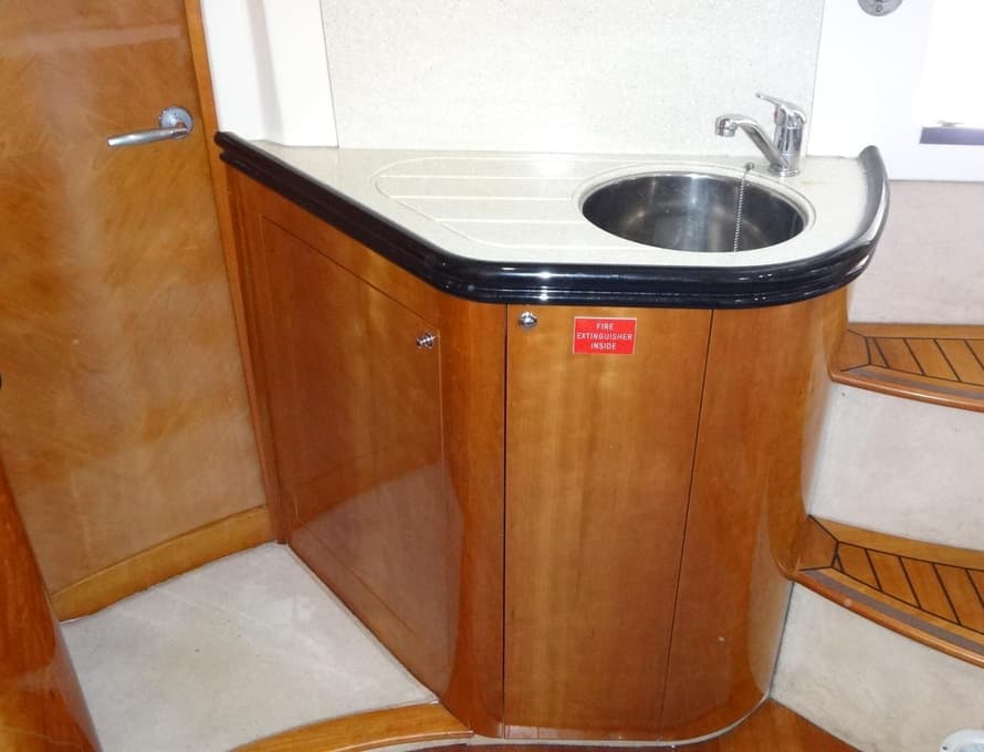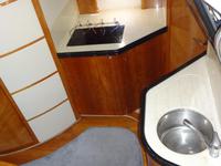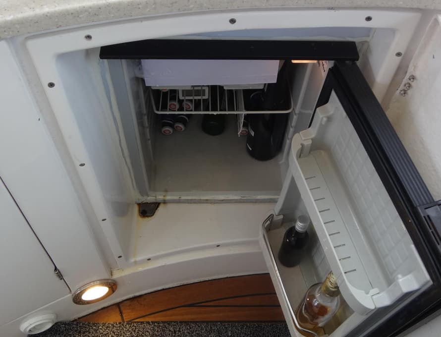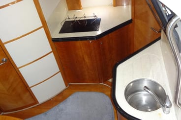 on the port side adjacent to the helm is the cockpit galley. This features a sink unit with storage below and an additional refrigerator.