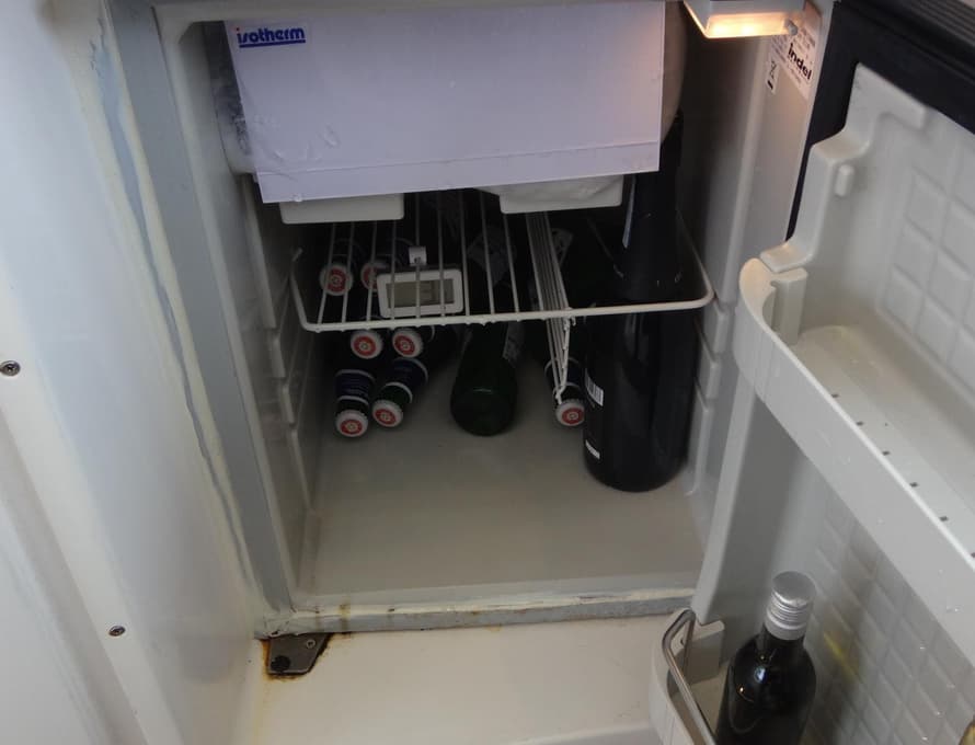Returning to the saloon and on the starboard side is the galley. Mr Castro has been very inventive here and has placed the sink unit on what would of been the dead space of the aft bulkhead adjacent to the saloon steps. This means that someone can use the hob, access the fridge whilst someone is doing the dishes. There is no gas onboard hence the generator option. There is a 2-burner ceramic induction hob, a Brand New Microwave oven and a large front opening Isotherm fridge for perishables. There is another fridge serving the cockpit situated at the top of the saloon steps so no great hardship to reach for a beer whilst relaxing in either the cockpit or the saloon.