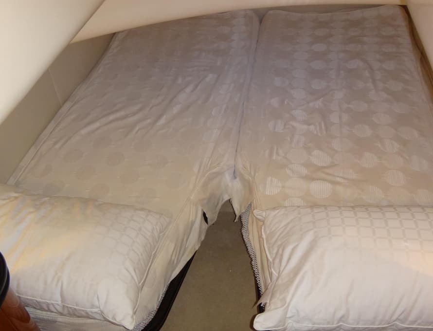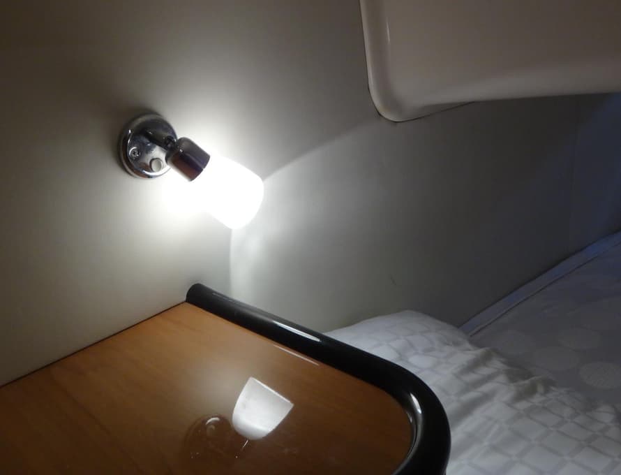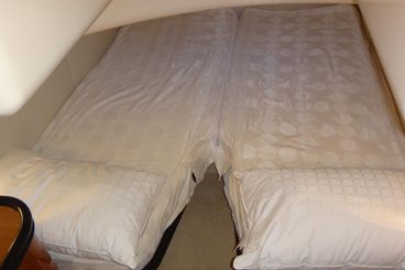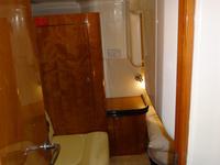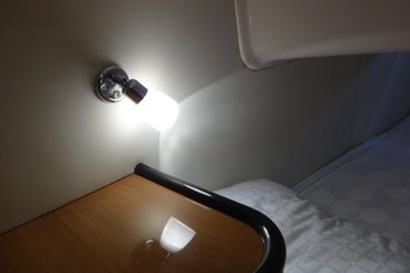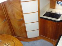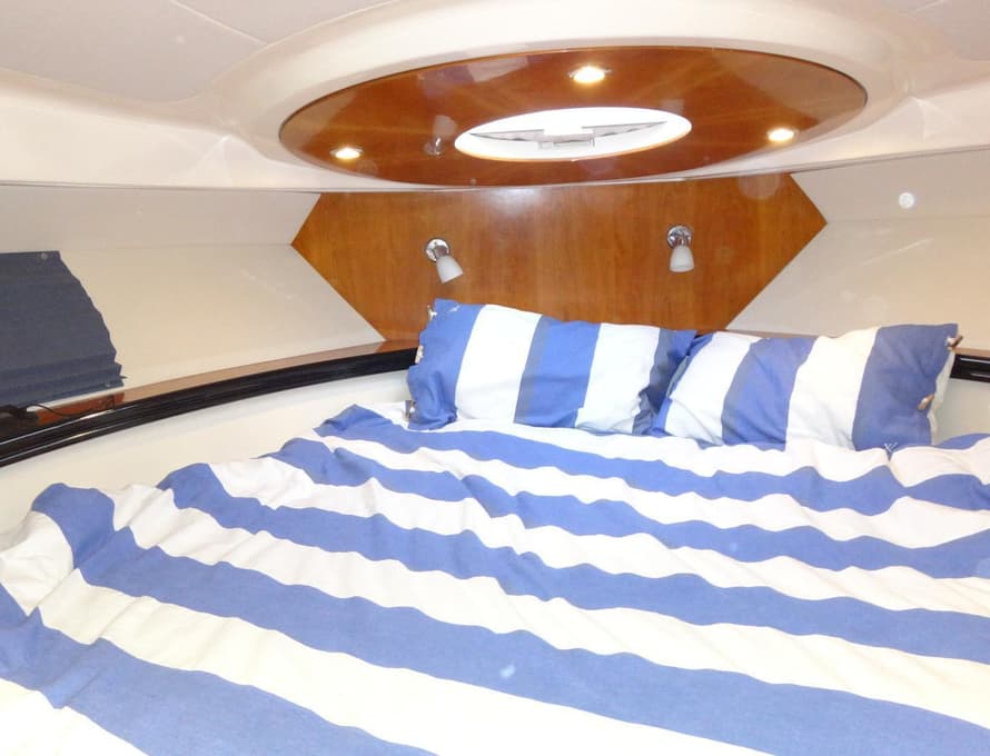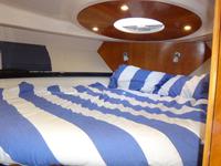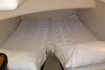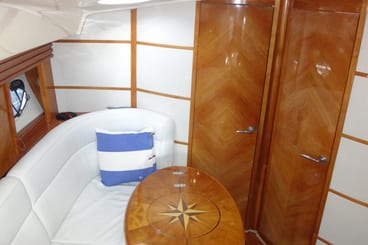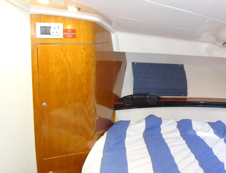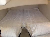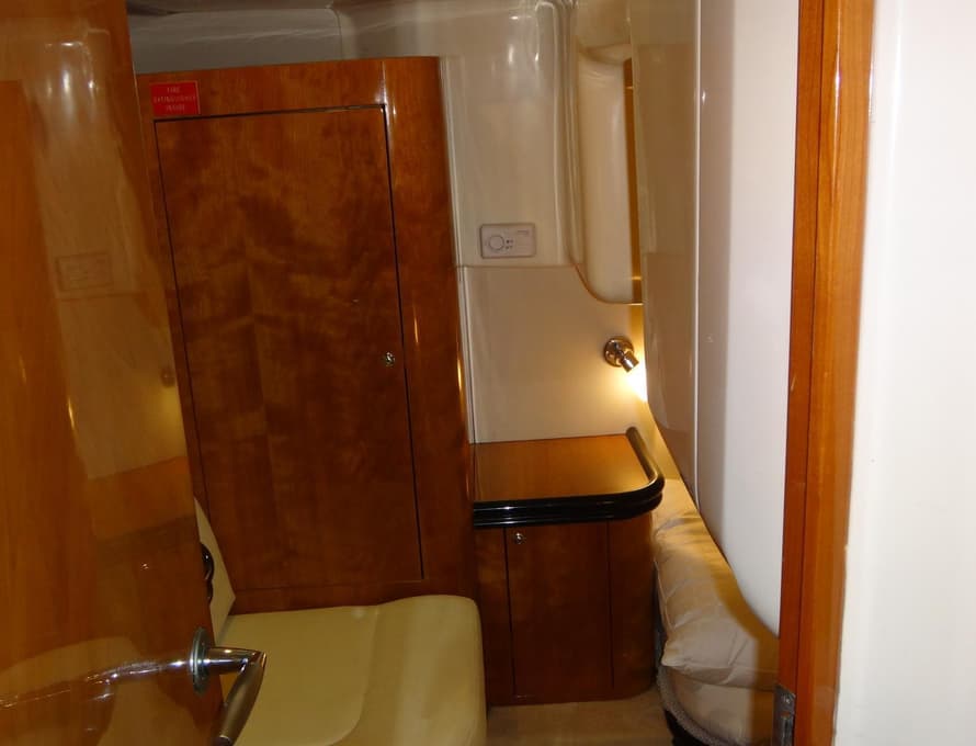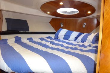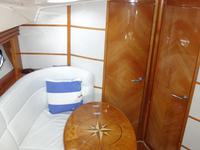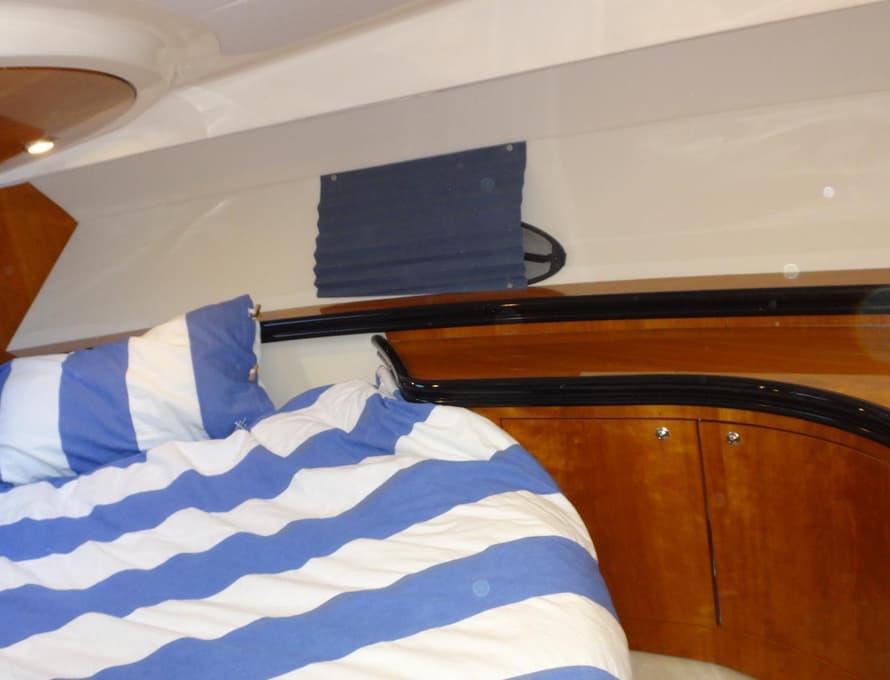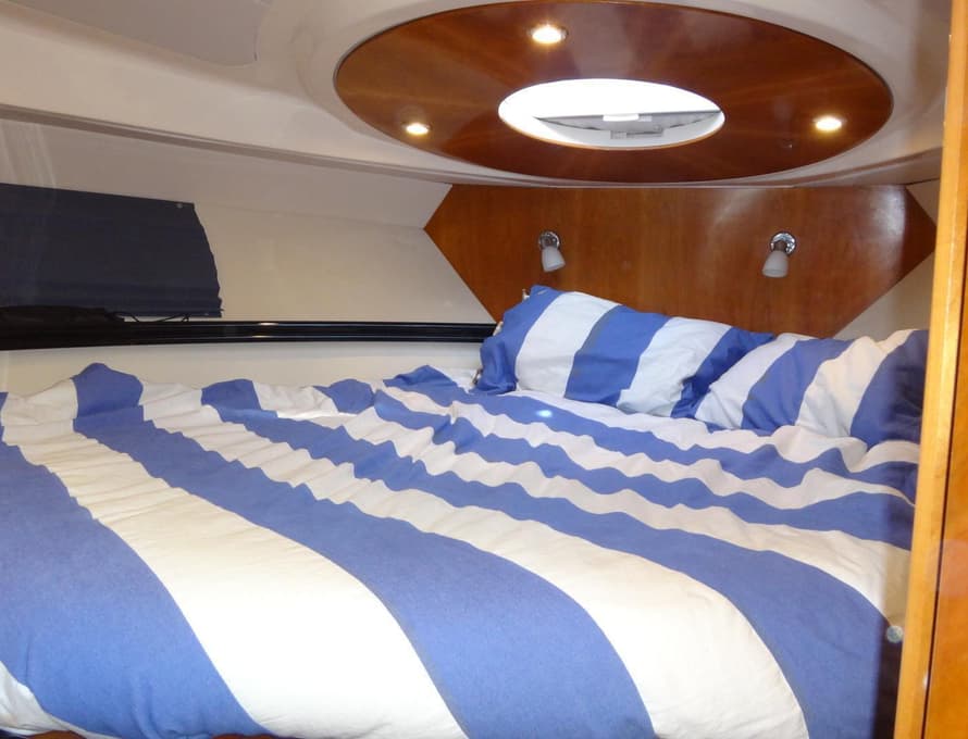 The aft cabin is one of the best i have seen on a 35 foot motor yacht, Full standing headroom on entry with hanging wardrobe, dressing seat and cupboard storage, A small step down and there are two single berths or the option to convert to double by adding an infill. The step down increases head hight when sitting up in bed which is an important feature, Lots of natural light from the hull port light as well as the additional hatch to the cockpit. 12V lighting throughout as well as air conditioning and heating outlets.