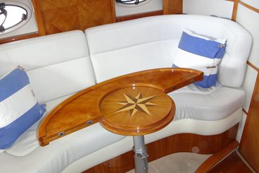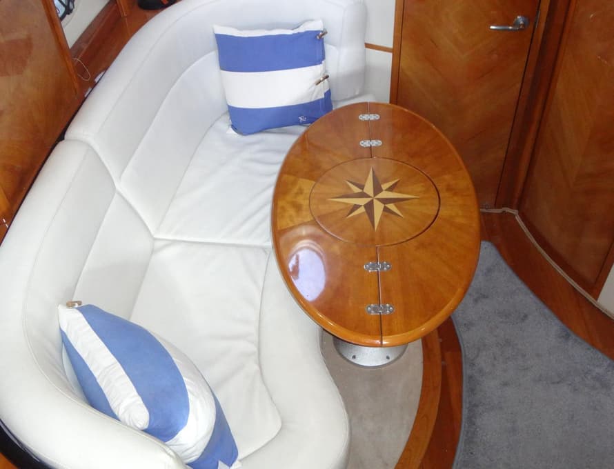 The main saloon is entered from the port side of the cockpit by a lockable sliding door, Two steps down and you enter the saloon. To port is the curved seating area with solid wood embossed table. The table has a folding leaf.