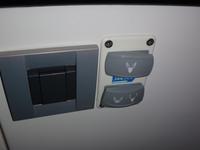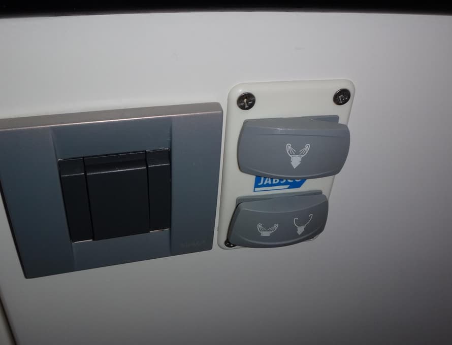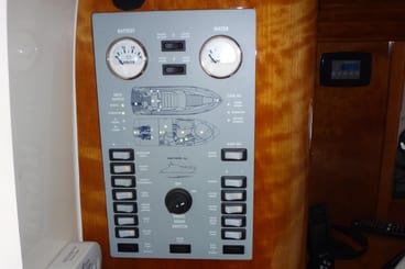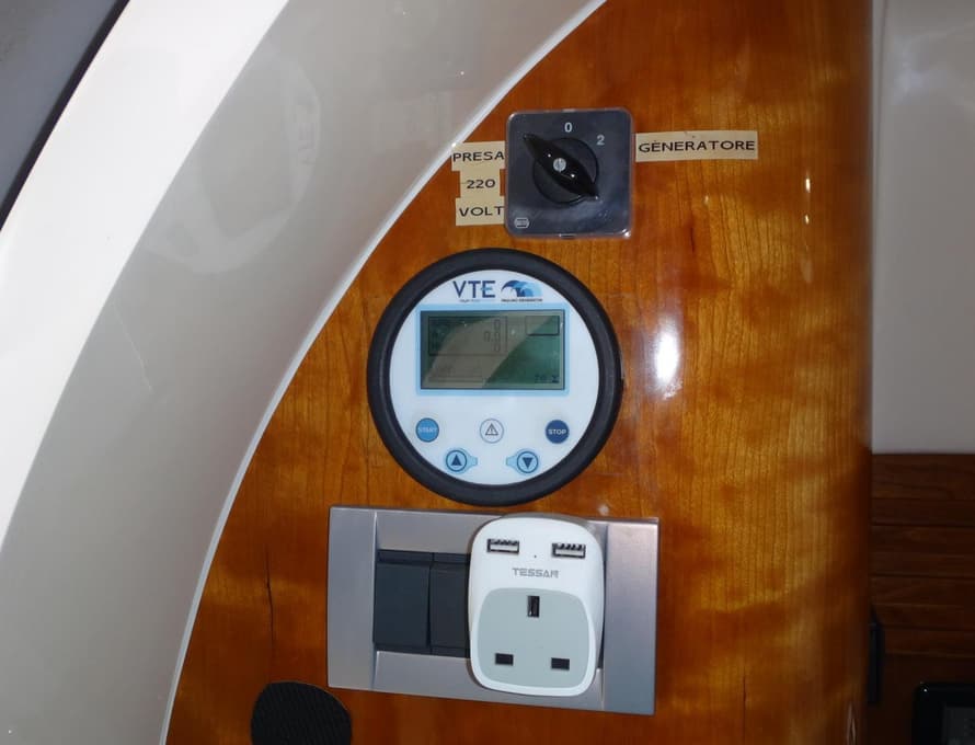 Bank of 4x12V batteries providing engine start, domestic power and bow thruster power. These are recharged via the engine alternators and onboard smart charger. The shore power cable has its own home in the cockpit moulding which leaves the cockpit uncluttered. 12/240V switch panel on entrance to saloon with illuminated rocker switches