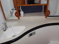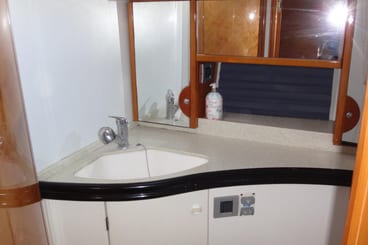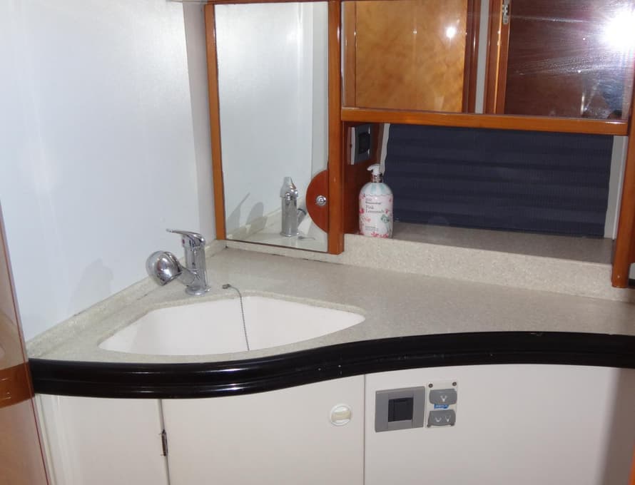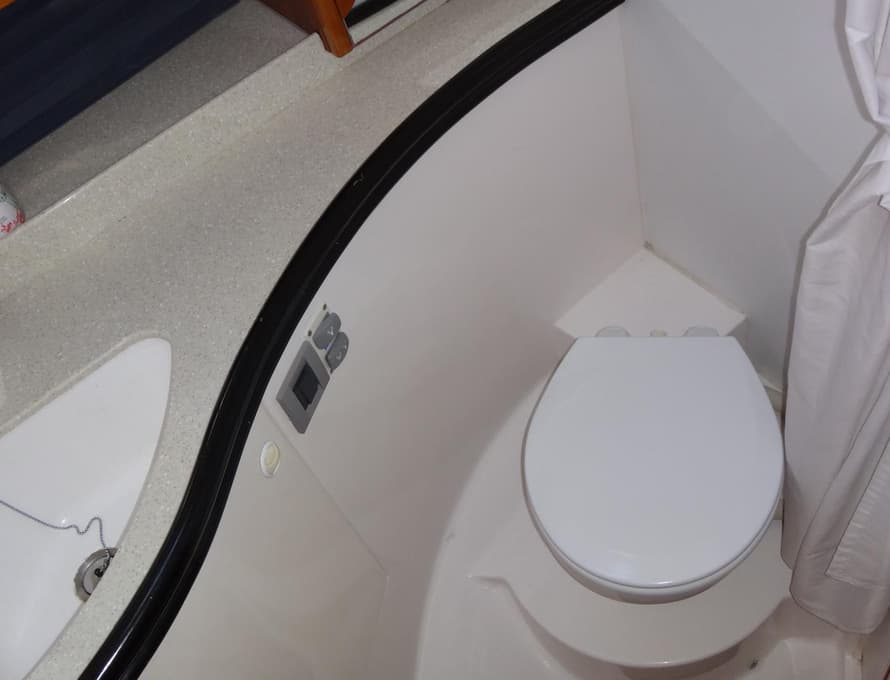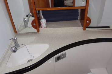 The heads is huge and can be accessed from both the forward cabin or the saloon. There is an electrically flushed ceramic heads. Space saving curved sink unit with stainless steel bowl and pull out shower head. Hull mounted, mirrored vanity units with his and her units. Opening port with fly screen. 12V deck head lighting. Teak grate with shower sump pump below.