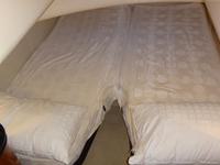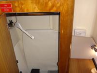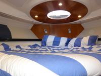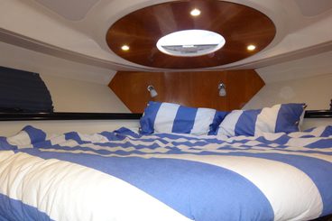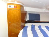 In the bow is the 'Owners' cabin with large double berth. This is raised allowing the space below to be accessed for storage. There is a hanging wardrobe to port and a dressing table to starboard with two large cupboards below. There is a large deck hatch fitted with both black out and fly screen blinds. 12V lighting and deck head lighting. Air conditioning and heating outlets.