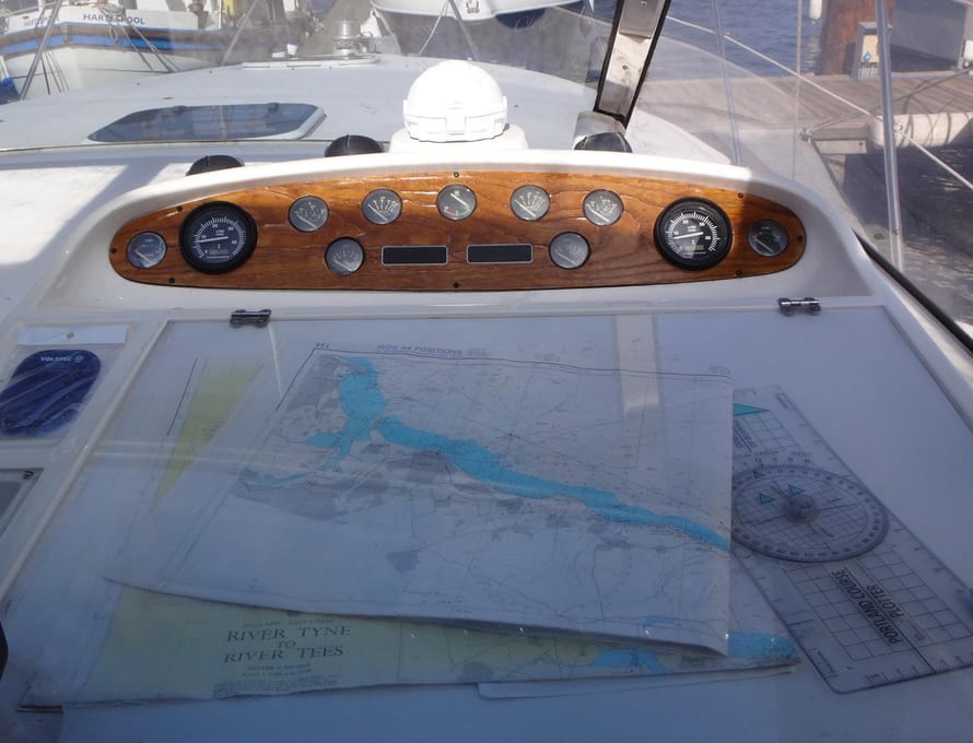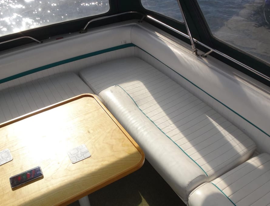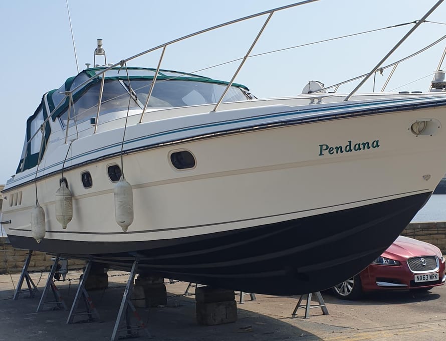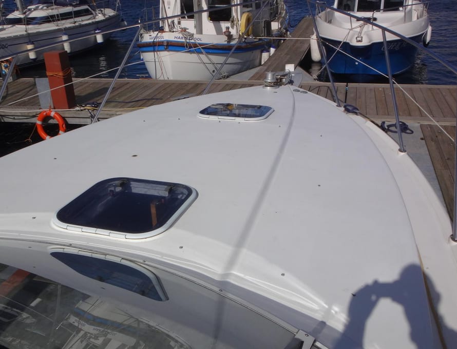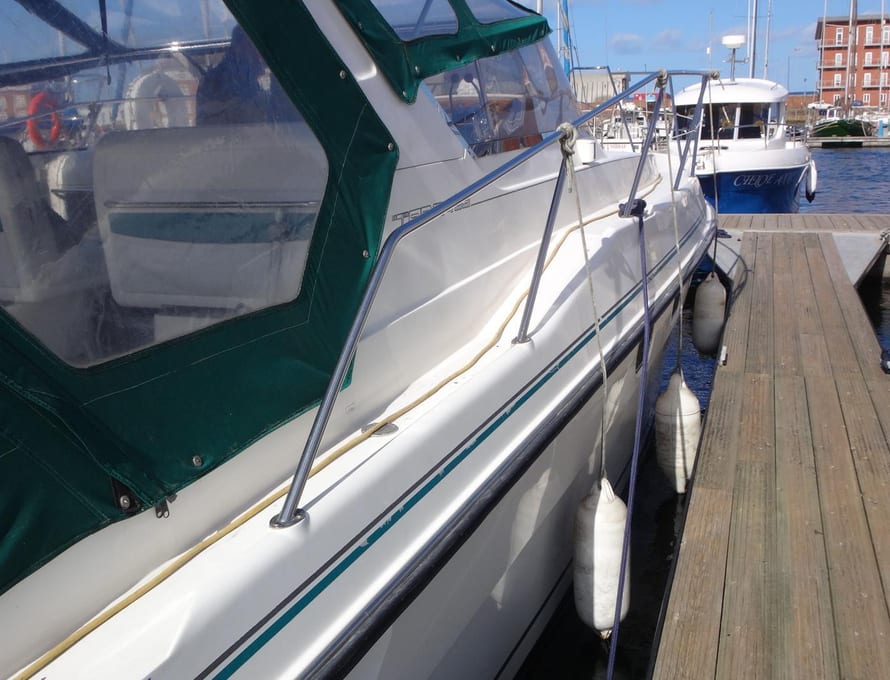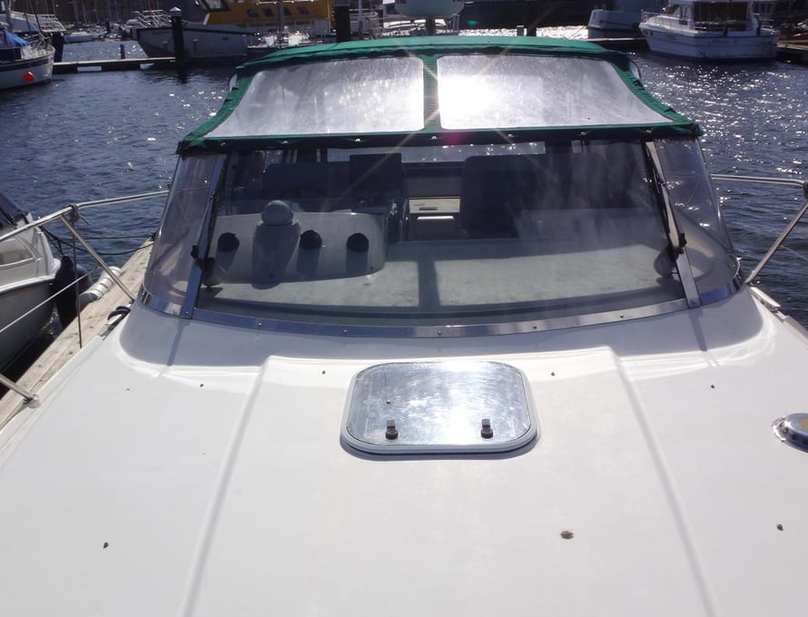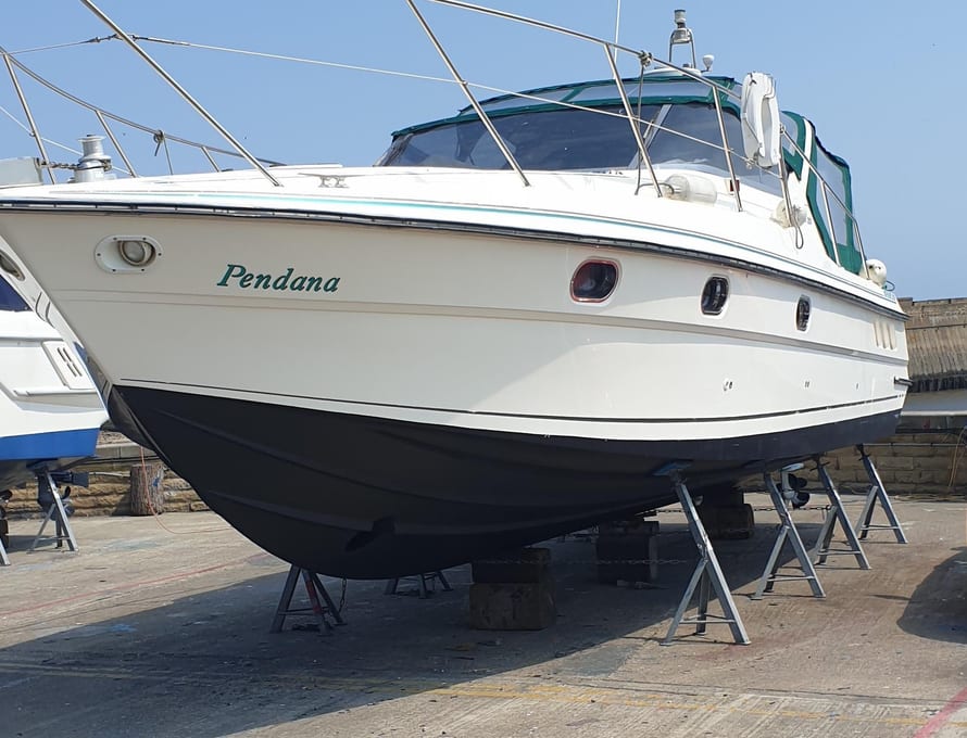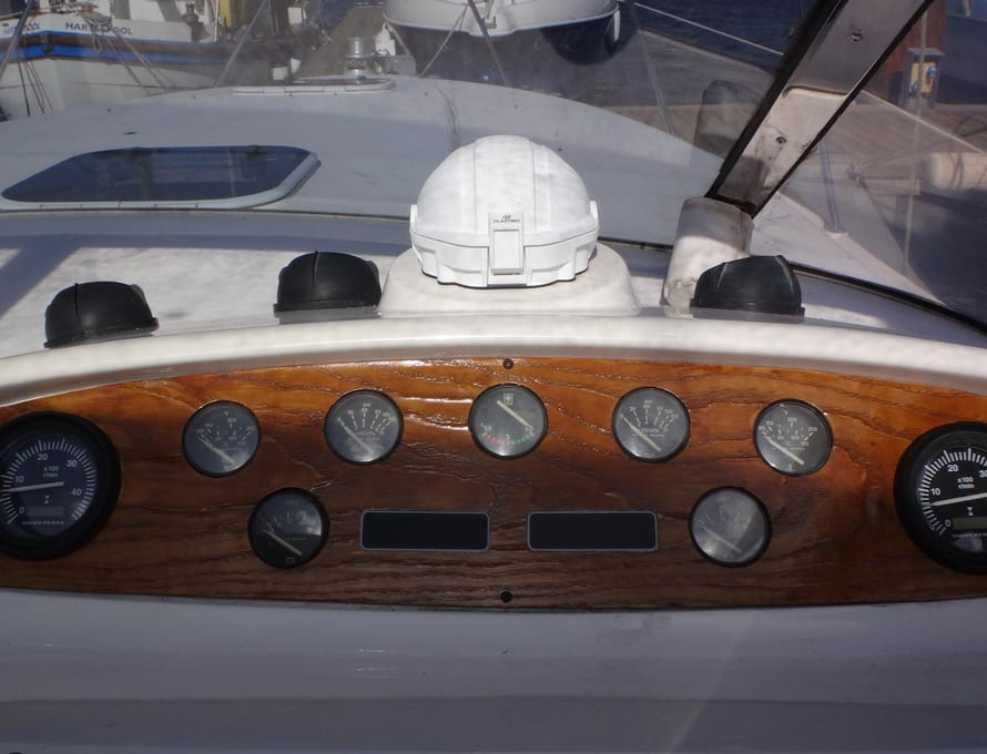 GRP Constructed motor yacht with heavy lay up hull. Planning hull profile with moulded spray strakes increasing gip and manoeuvrability at both low and high speeds. Handling in tight situations is a piece of cake thanks to her twin engines and soft throttle allowing instant control. This is further eased by the addition of a bow thruster. Her underwater areas are antifouled annually, and her hull is given a good polish.