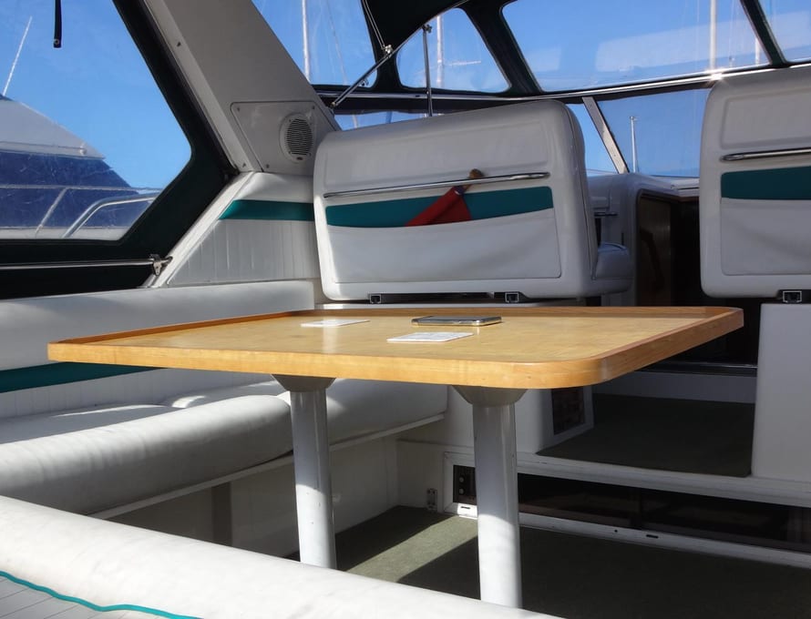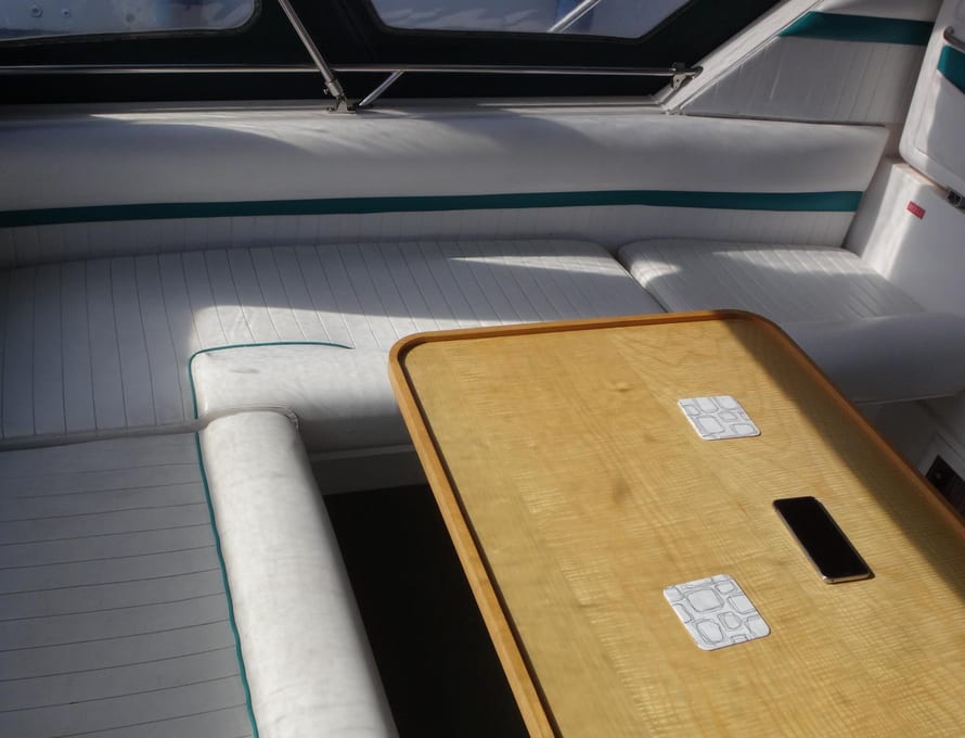 Built in bathing platform with integral ladder and fender storage. There have been snap davits fitted should a tender be needed to be stored inflated. Transom gate on starboard side access lower cockpit with large U-shaped seating area to port with huge dining table. This area converts to a huge sun pad. There is a single seat on starboard side adjacent to the cockpit fridge. Whoever sits there is waiter for the day,