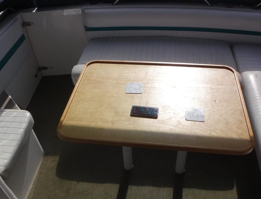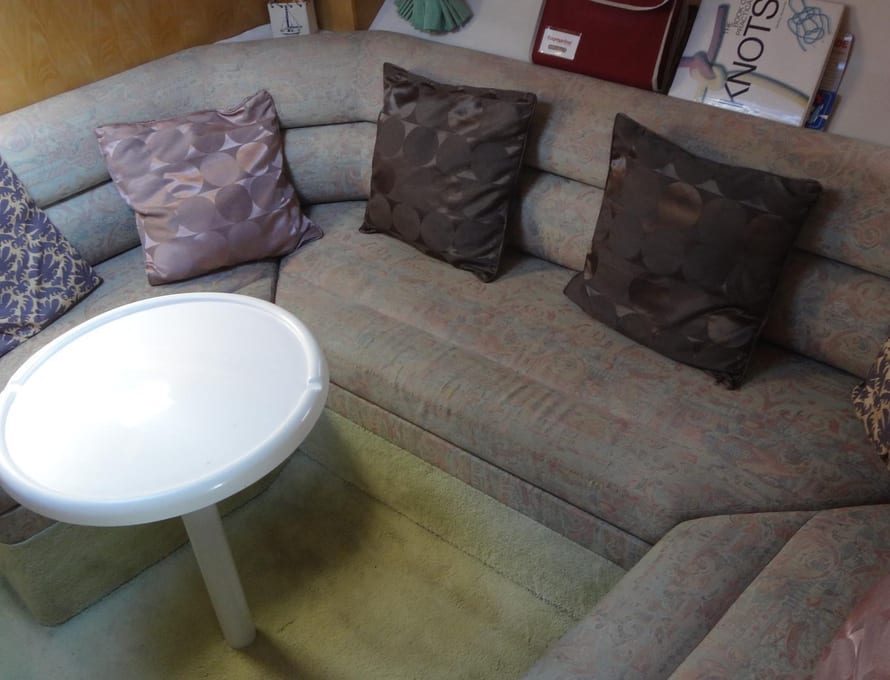 Opposite the galley is the U-shaped saloon seating area. This comfortable spot has a choice of both a large wooden table and a small circular affair depending on number of guests on board. Where Fairline have been clever is that this area will convert to a double but uses slot in base sections and purpose made infill cushions found beneath the settee. The larger saloon table has a permanent home in the aft cabin when not in use. There are 12V reading lights and curtains which make the saloon a cosy place of an evening. During the day, the angled, opening portholes reflect natural light from the water and allow ventilation.