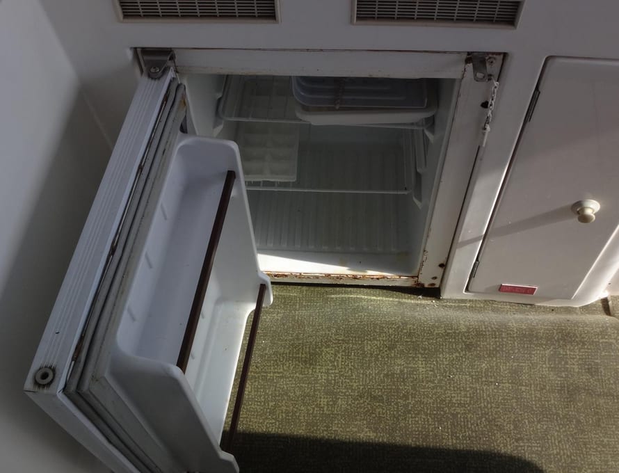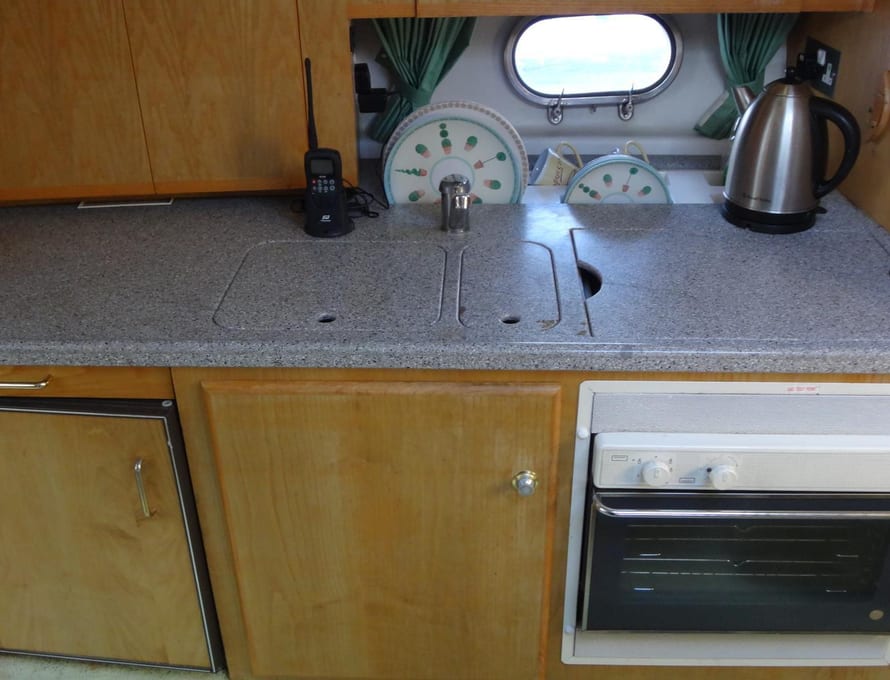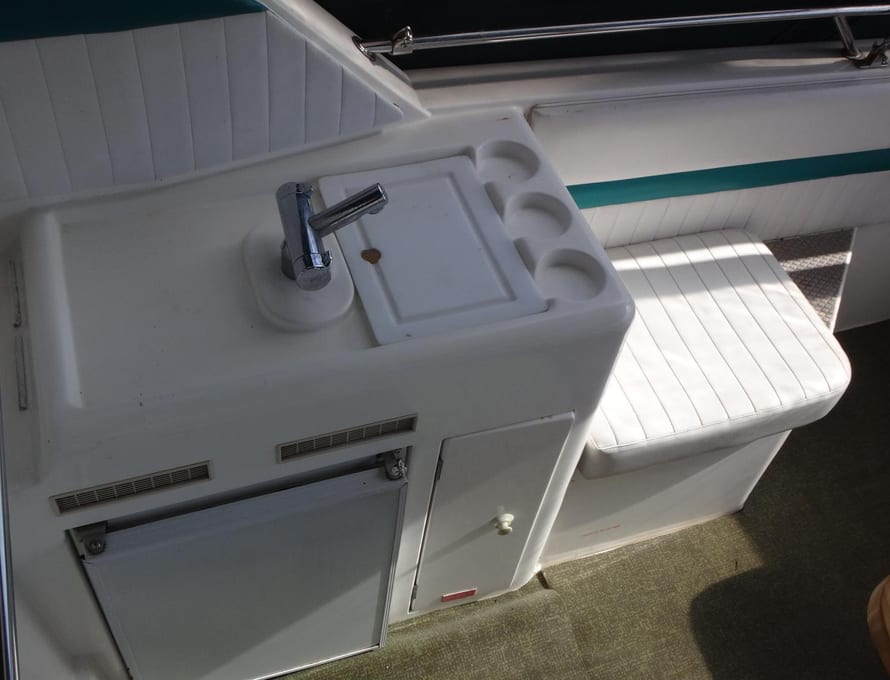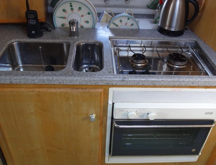 To port is the linear galley with hard wearing, easy clean Corian worktops. It isn’t immediately apparent, but the worktops are deep giving far greater volume to the preparation areas, This also allows for greater storage aft including a drainer. For those who like to cook onboard there is a 2-burner gas hob with cover. Below this and built into the units is a separate gas fuelled oven with separate grill. There is a double stainless-steel sink with pressurised hot and cold water through a mixer tap. Front loading fridge with ice compartment which can be used solely for perishables leaving the cockpit fridge to look after the alcohol. There is good height storage cupboard for crockery and ambient goods.