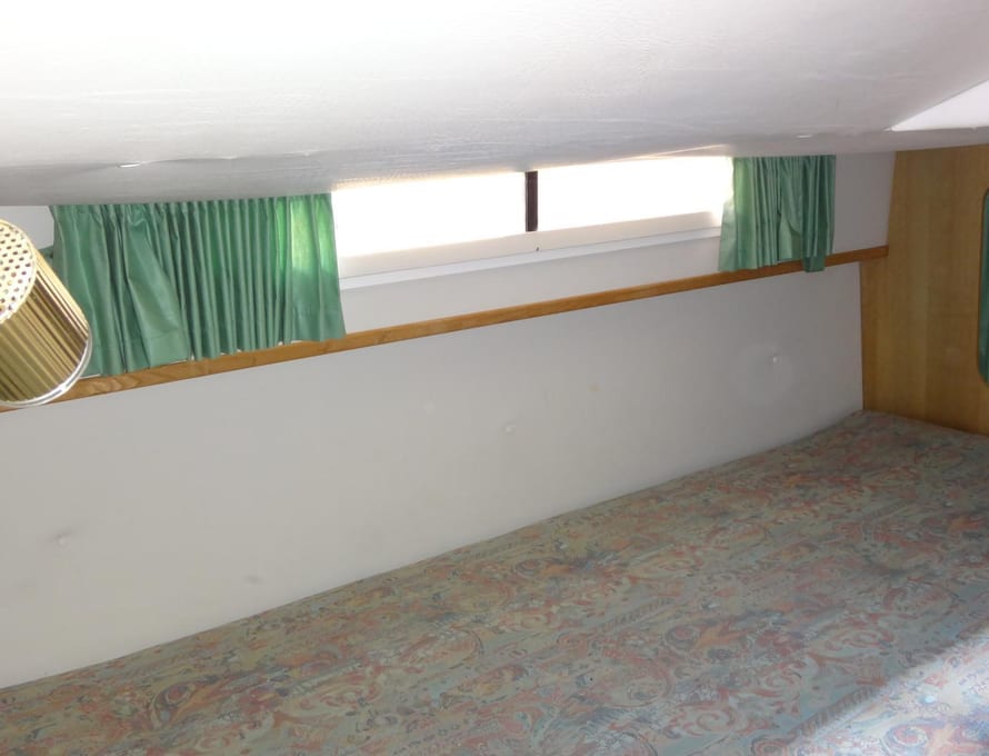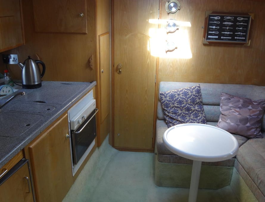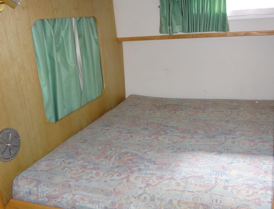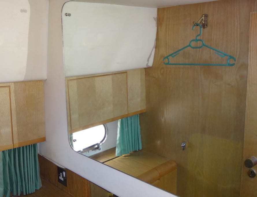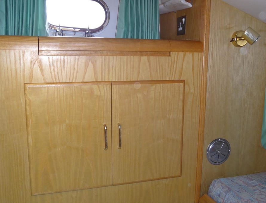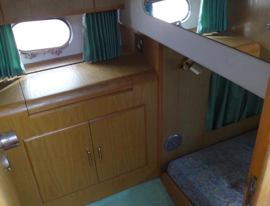 There are two dedicated sleeping cabins. The bow cabin has a privacy door and on entering seems small. This is definitely an optical illusion as the offset berth is no less than 7 feet long and just over 4 feet wide. There is a good-sized dressing table and a very goo hanging wardrobe. There is further space to be found though the double doors in the bed base. 12V lighting and a large deck hatch for natural light and ventilation.