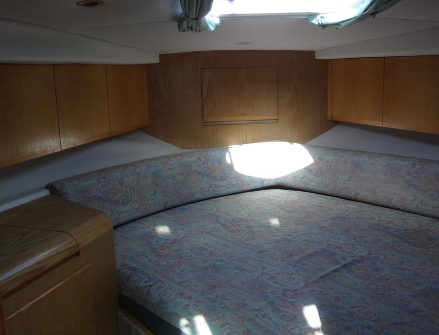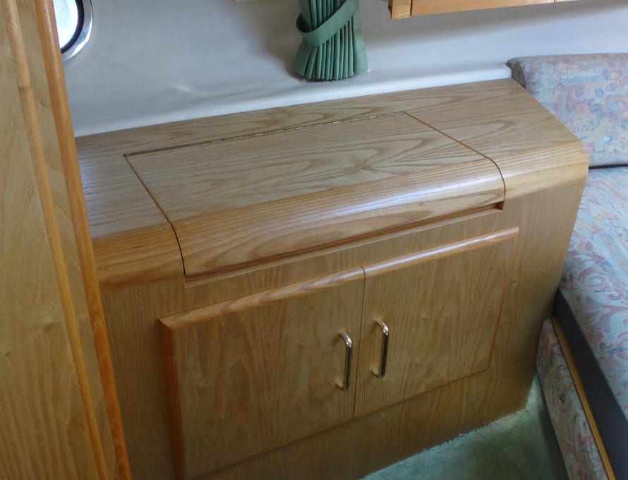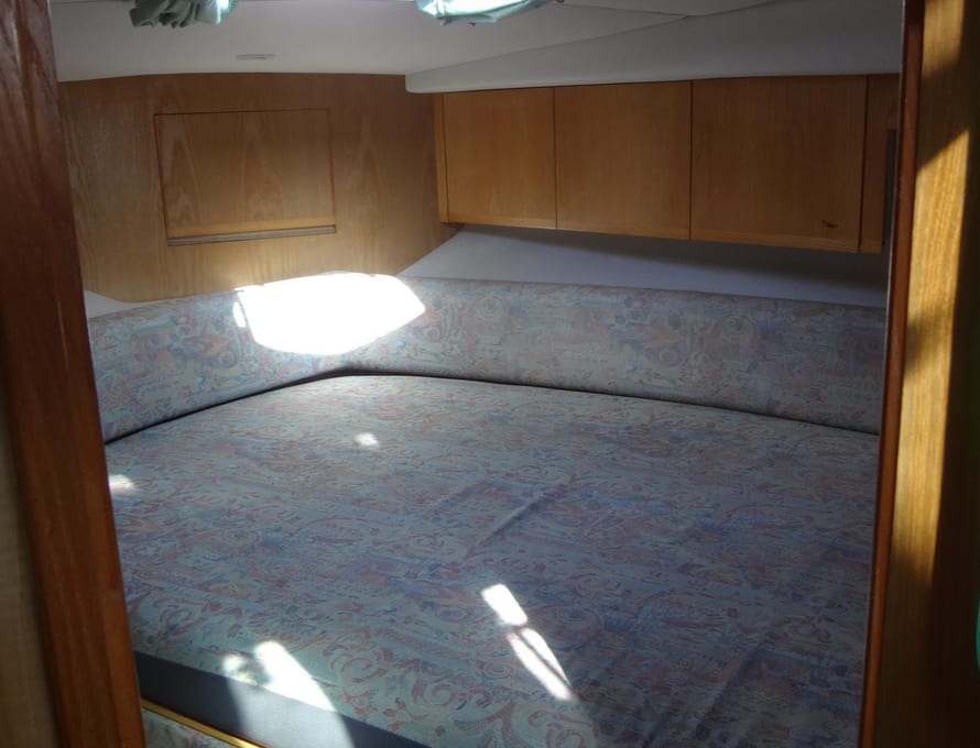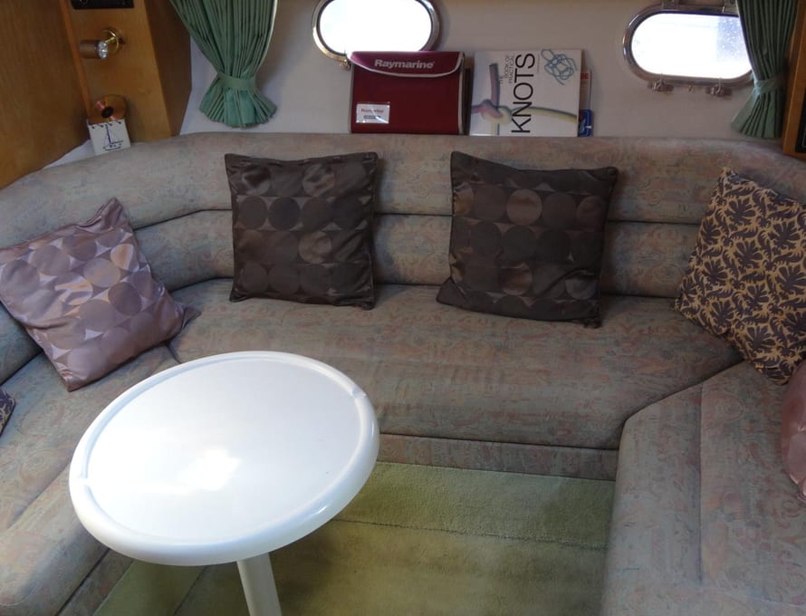 Below decks is both spacious and welcoming. The light mahogany veneers and trims give the boat a modern feel whilst the fabrics, although original offer neutrality and are clean and comfortable. The emphasis is definitely on the living and this boat can accommodate a cruising couple for weeks on end.