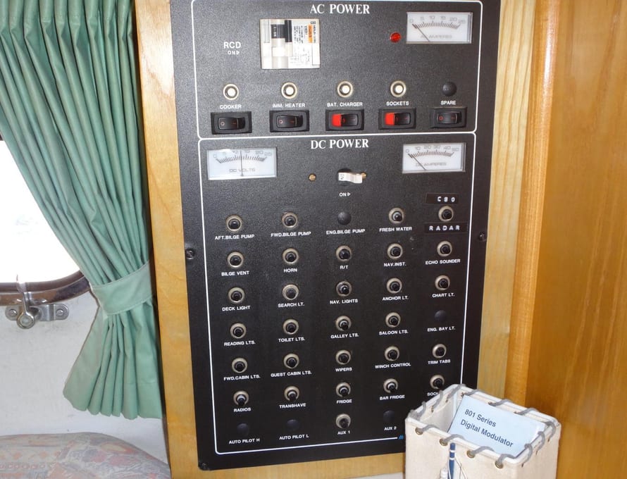 Full 12/240V systems on board. There is a bank of 5x12V batteries providing engine start, domestic power, and bow thruster power. These are fitted with isolators and are recharged via the engine alternator and the onboard smart charger. 12/220V switch panel in saloon with fused selector switches. This is also fitted with an RCD breaker for safety. 3-pin sockets in cabins, galley, and saloon.