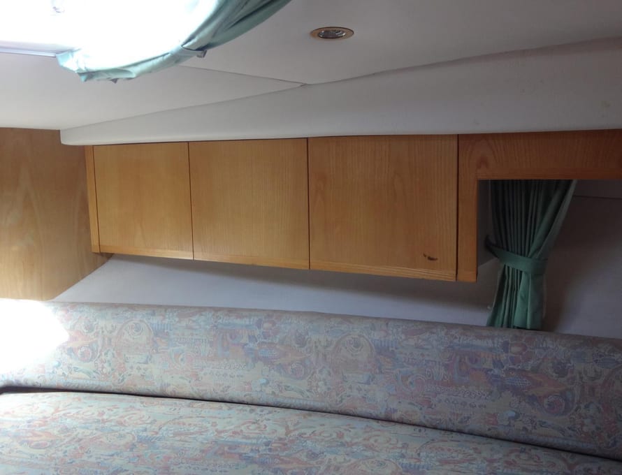 The aft cabin, often a space overlooked in sports cruisers is a revelation. It is bright, has a similarly sized berth to the forward cabin. Where this cabin differs is the slightly better headroom. They have still managed to pride a dressing table and the cupboard storage is good. The mirrored half bulkhead increases natural light and the illusion of space.