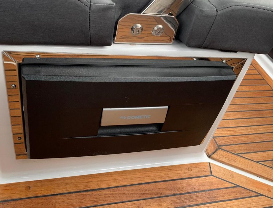Step up into the cockpit and you have a Dometic fridge under the navigators seat, and a sink to port