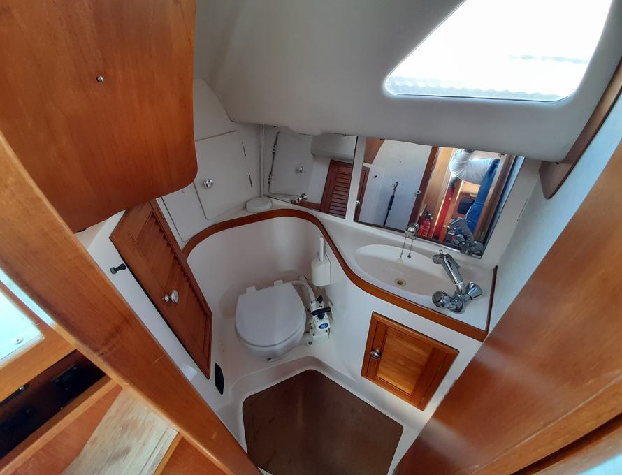 The heads offers a wash basin vanity with hot and cold water. Marine toilet with macerator pump out or alternative deck pump out so that the holding tank can be bypassed if needed. The shower is thermostatically controlled with pump out for the shower tray.
