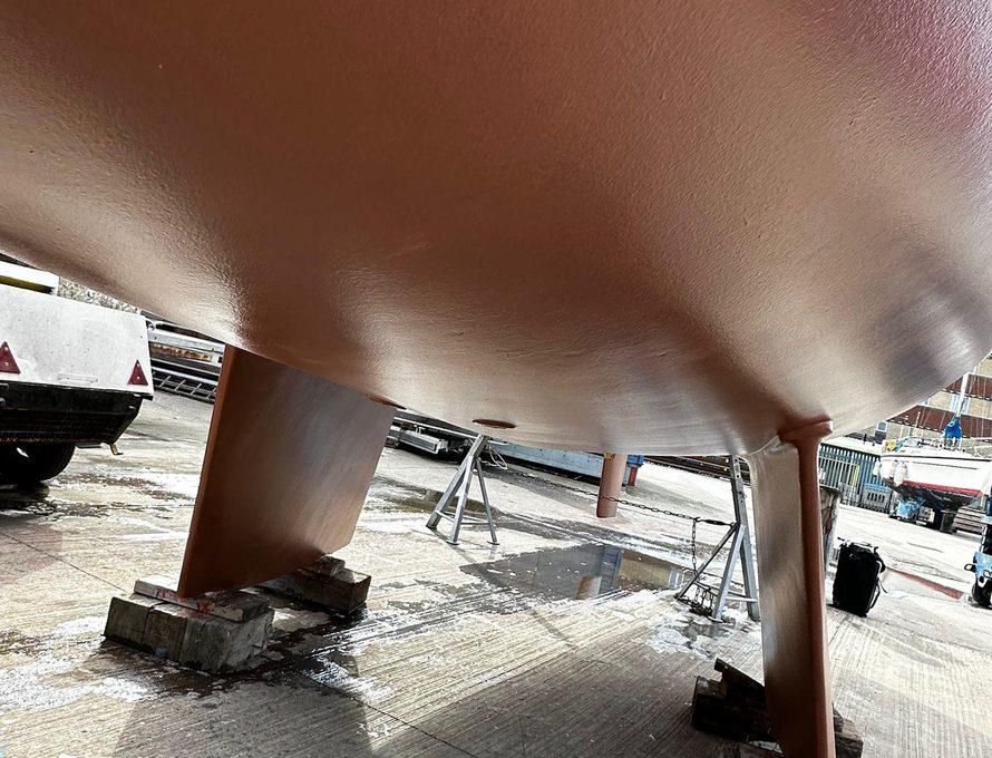 GRP Constructed sailing vessel with twin cast bilge keels and counter hung rudder with tiller steering. Under water areas were copper coated professionally by Amble Boat Company in 2015. These coatings were refreshed in September 2025.
