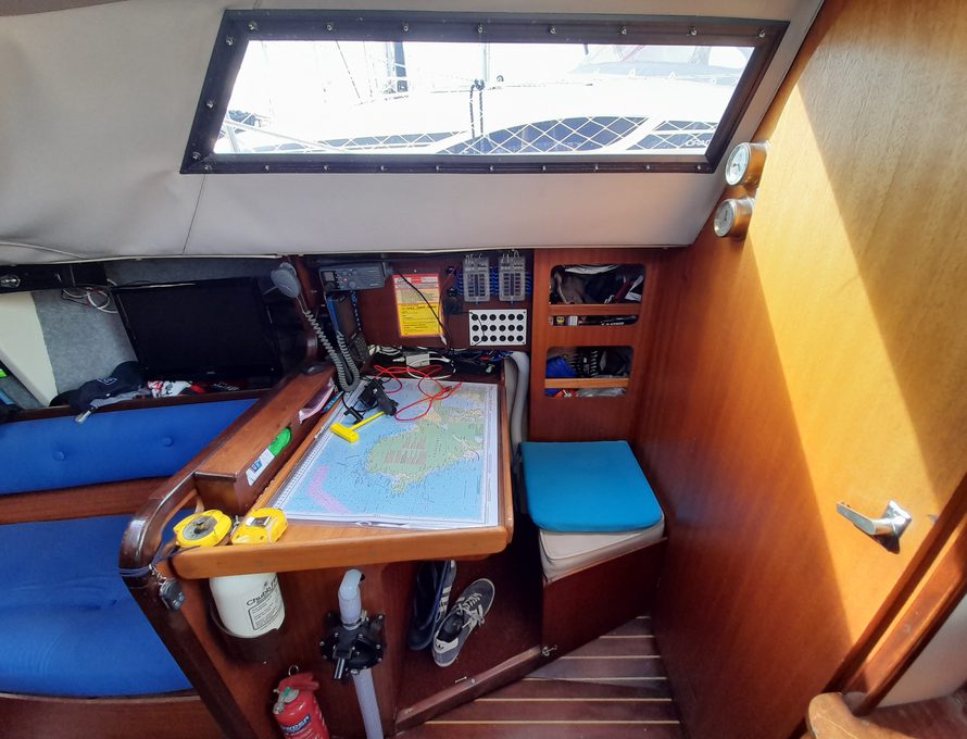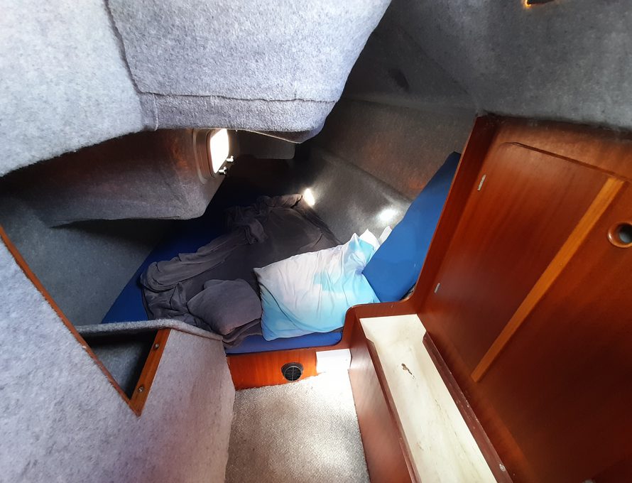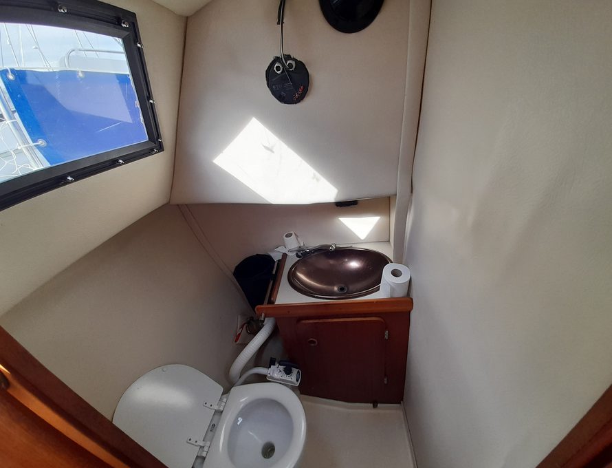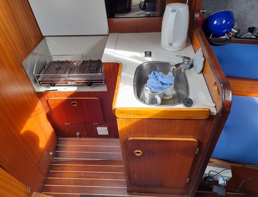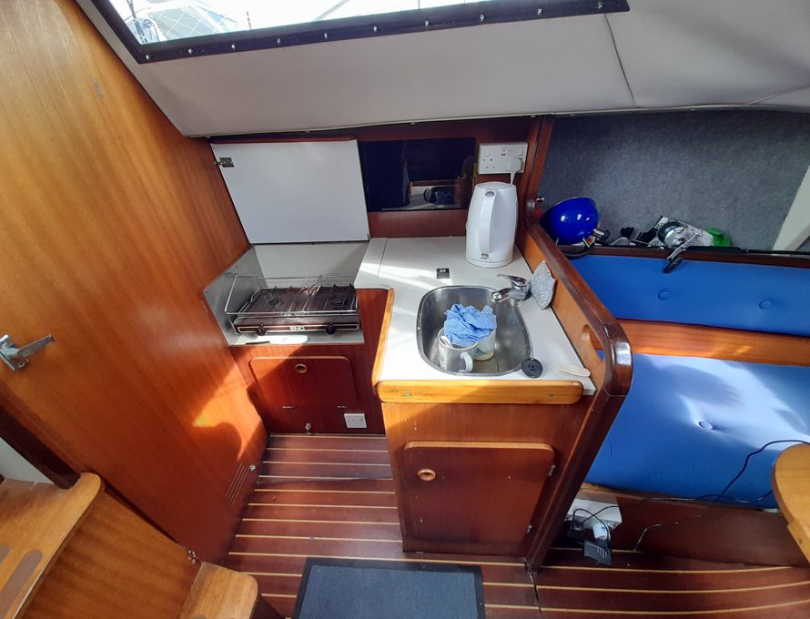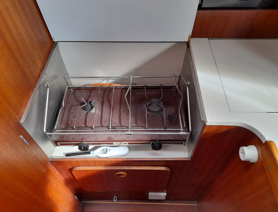 Below deck, the open plan saloon with a central folding leaf table is spacious and offers comfortable U-Shaped seating. The chart table with an electrical panel sits forward of the heads compartment which has a sea toilet and washbasin. The sea toilet has been newly installed along with seacocks. The contribution of the teak woodwork and trims reinforces the light and amazingly commodious character of the Fantasia 27 below decks. The set choice of aft cabin, quite separate with its double berth in symmetry with the head, leaves free the appointment midship and forward of the L-shaped saloon and double-berth forward, with 1,80 m (5'11') headroom throughout! Accommodation for 4 with an aft double cabin and 2 saloon berths either as single berths or a V berth double. L-shaped galley with sink and pressurised cold water, 2 burner gas hob and grill, icebox, and a variety of storage. The galley positioned to the port side comprises two-burner gas stove and in counter ice box along with stainless steel sink.